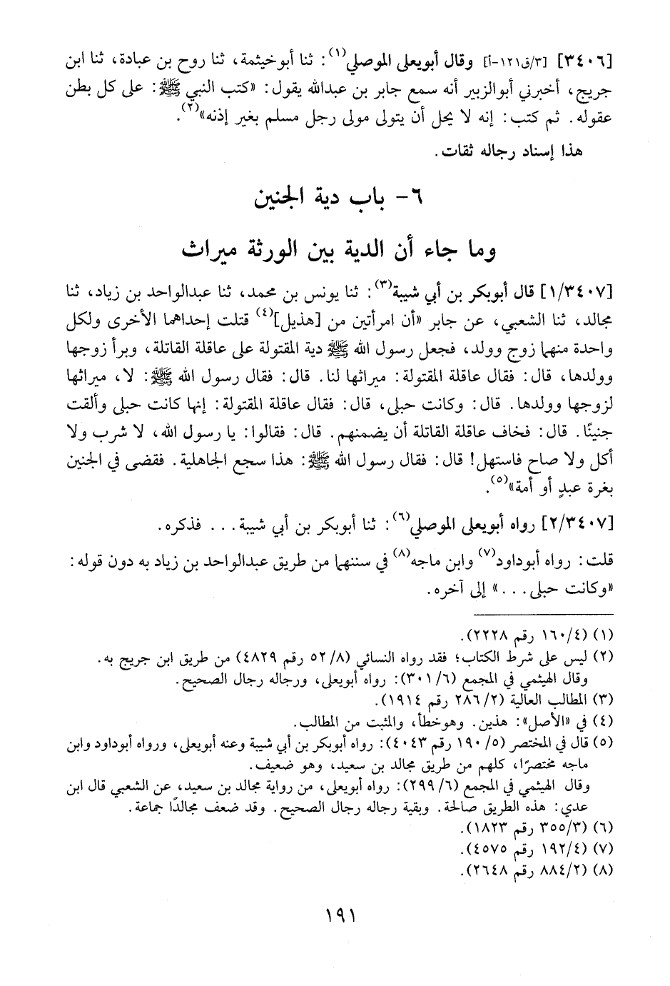 3407 / 1 - - قَالَ أَبُو بَكْرِ بْنُ أَبِي شَيْبَةَ. ثَنَا يونس بن عمد، ثنا عَبْدُ الْوَاحِدِ بْنُ زِيَادٍ، ثنا مُجَالِدٌ، ثنا الشعبي، على جابر {أن امرأتين من هذيل، قَتَلَتْ إِحْدَاهُمَا الْأُخْرَي وَلِكُلِّ وَاحِدَةٍ مِنْهُمَا زَوْجٌ وَوَلَدٌ، فَجَعَلَ رَسوُلُ اللَّهِ - صَلَّى اللَّهُ عَلَيْهِ وَسَلَّمَ - دِيَةَ الْمَقْتُولَةِ عَلَى عَاقِلَةِ الْقَاتِلَةِ، وَبَرَّأَ زَوْجَهَا وَوَلَدَهَا، قَالَ: فَقَالَ عَاقِلَةُ الْمَقْتُولَةِ: مِيرَاثُهَا لَنَا. قَالَ: فَقَالَ رَسُولُ اللَّهِ - صَلَّى اللَّهُ عَلَيْهِ وَسَلَّمَ -: لَا، مِيرَاثُهَا لِزَوْجِهَا وَوَلَدِهَا. قَالَ: وَكَانَتْ حُبْلَى، قَالَ: فَقَالَ عَاقِلَةُ الْمَقْتُولَةِ: إِنَّهَا كَانَتْ حُبْلَى وَأَلْقَتْ جَنِينًا. قَالَ. فَخَافَ عَاقِلَةُ القاتلة أن يضمنهم. قال: فَقَالُوا: يَا رَسُولَ اللَّهِ، لَا شَرِبَ وَلَا أَكَلَ وَلَا صَاحَ فَاسْتَهَلَّ قَالَ: فَقَالَ رَسُولُ اللَّهِ - صَلَّى اللَّهُ عَلَيْهِ وَسَلَّمَ -: هَذَا سَجْعُ الْجَاهِلِيَّةِ. فَقَضَى فِي الْجَنِينِ بِغُرَّةٍ عبدٍ أَوْ أَمَةٍ} .