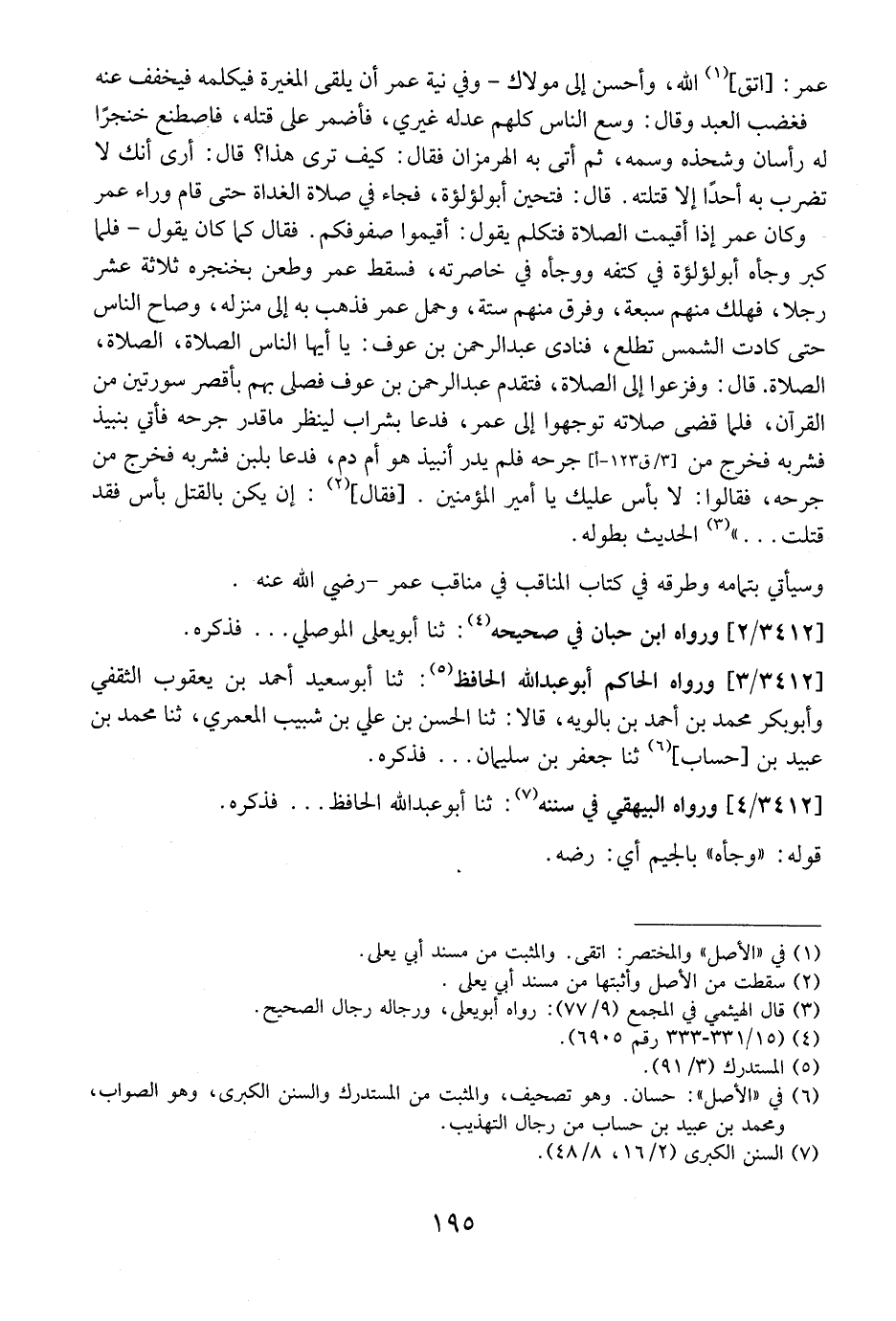 عُمَرُ: اتَّقِ اللَّهَ، وَأَحْسِنْ إِلَى مَوْلَاكَ- وَفِي نِيَّةِ عُمَرَ أَنْ يَلْقَى الْمُغِيرَةَ فَيُكَلِّمَهُ فَيُخَفِّفَ عَنْهُ فَغَضِبَ العَبْدُ وَقَالَ: وَسِعَ النَّاسَ كُلَّهُمْ عَدْلُهُ غَيْرِي، فَأَضْمَرَ عَلَى قَتْلِهِ، فَاصْطَنَعَ خِنْجَرًا لَهُ رَأْسَانِ وَشَحَذَهُ وَسَمَّهُ، ثُمَّ أَتَى بِهِ الْهُرْمُزَانَ فَقَالَ: كَيْفَ تَرَى هَذَا؟ قَالَ: أَرَى أَنَّكَ لَا تَضْرِبُ بِهِ أَحَدًا إِلَّا قَتَلْتَهُ. قَالَ: فَتَحَيَّنَ أَبُو لُؤْلُؤَةَ، فَجَاءَ فِي صَلَاةِ الْغَدَاةِ حَتَّى قَامَ وَرَاءَ عُمَرَ وَكَانَ عُمَرُ إِذَا أُقِيمَتِ الصَّلَاةُ فَتَكَلَّمَ يَقُولُ: أَقِيمُوا صُفُوفَكُمْ. فَقَالَ كَمَا كَانَ يَقُولُ- فَلَمَّا كَبَّرَ وَجَأَهُ أَبُو لُؤْلُؤَةَ فِي كَتِفِهِ وَوَجَأَهُ فِي خَاصِرَتِهِ، فَسَقَطَ عُمَرُ وَطَعَنَ بِخِنْجَرِهِ ثَلَاثَةَ عَشَرَ رَجُلًا، فَهَلَكَ مِنْهُمْ سَبْعَةٌ، وَفَرَقَ مِنْهُمْ سِتَّةٌ، وَحُمِلَ عُمَرُ فَذُهِبَ بِهِ إِلَى مَنْزِلِهِ، وَصَاحَ النَّاسُ حَتَّى كَادَتِ الشَّمْسُ تَطْلُعُ، فَنَادَى عَبْدُ الرَّحْمَنِ بْنُ عَوْفٍ: يَا أَيُّهَا النَّاسُ الصَّلَاةَ، الصَّلَاةَ، الصَّلَاةَ. قَالَ: وَفَزِعُوا إِلَى الصَّلَاةِ، فَتَقَدَّمَ عَبْدُ الرَّحْمَنِ بْنُ عَوْفٍ فَصَلَّى بِهِمْ بِأَقْصَرِ سُورَتَيْنِ مِنَ الْقُرْآنِ، فَلَمَّا قَضَى صَلَاتَهُ تَوَجَّهُوا إِلَى عُمَرَ، فَدَعَا بِشَرَابٍ لِيَنْظُرَ ماقدر جُرْحِهِ فَأُتِيَ بِنَبِيذٍ فَشَرِبَهُ فَخَرَجَ مِنْ جُرْحِهِ فَلَمْ يَدْرِ أَنَبِيذٌ هُوَ أَمْ دَمٌ، فَدَعَا بِلَبَنٍ فَشَرِبَهُ فَخَرَجَ مِنْ جُرْحِهِ، فَقَالُوا: لَا بَأْسَ عَلَيْكَ يَا أَمِيرَ الْمُؤْمِنِينَ. فَقَالَ: إِنْ يَكُنْ بِالْقَتْلِ بَأْسٌ فَقَدْ قُتِلْتَ ... } . الْحَدِيثَ بِطُولِهِ.