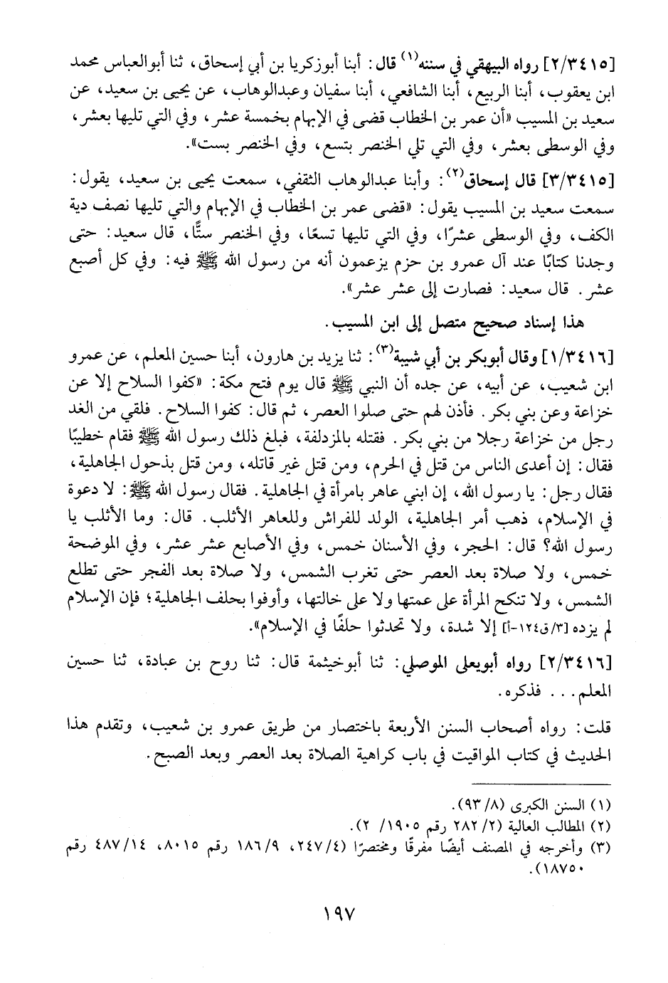 3415 / 2 - - رواه البيهقي في سننه قال: أبنا أَبُو زَكَرِيَّا بْنُ أَبِي إِسْحَاقَ، ثنا أَبُو العباس محمد ابن يعقوب، أبنا الربيع، أبنا الشافعي، أبنا سفيان وعبد الوهاب، عن بجيى بْنُ سَعِيدٍ، عَنْ سَعِيدِ بْنِ الْمُسَيِّبِ {أَنَّ عُمَرَ بْنَ الْخَطَّابِ قَضَى فِي الْإِبْهَامِ بِخَمْسَةِ عَشَرَ، وَفِي الَّتِي تَلِيهَا بِعَشْرٍ، وَفِي الْوُسْطَى بعشر، وفي التي تلي الْخِنْصَرُ بِتِسْعٍ، وَفِي الْخِنْصَرِ بِسِتٍّ} .