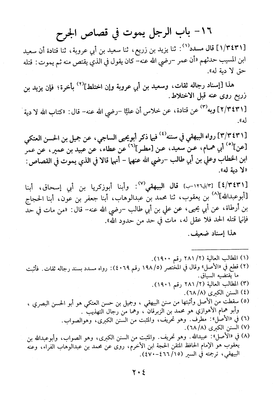 3431 / 1 - - قَالَ مُسَدَّدٌ: ثَنَا يَزِيدُ بْنُ زُرَيْعٍ، ثَنَا سَعِيدُ بْنُ أَبِي عَرُوبَةَ، ثَنَا قَتَادَةُ أَنَّ سَعِيدَ ابن الْمُسَيِّبِ حَدَّثَهُمْ {أَنَّ عُمَرَ- رَضِيَ اللَّهُ عَنْهُ- كان يقول في الذي يقتص منه ثم يموت: قتله حق لا دية له} .