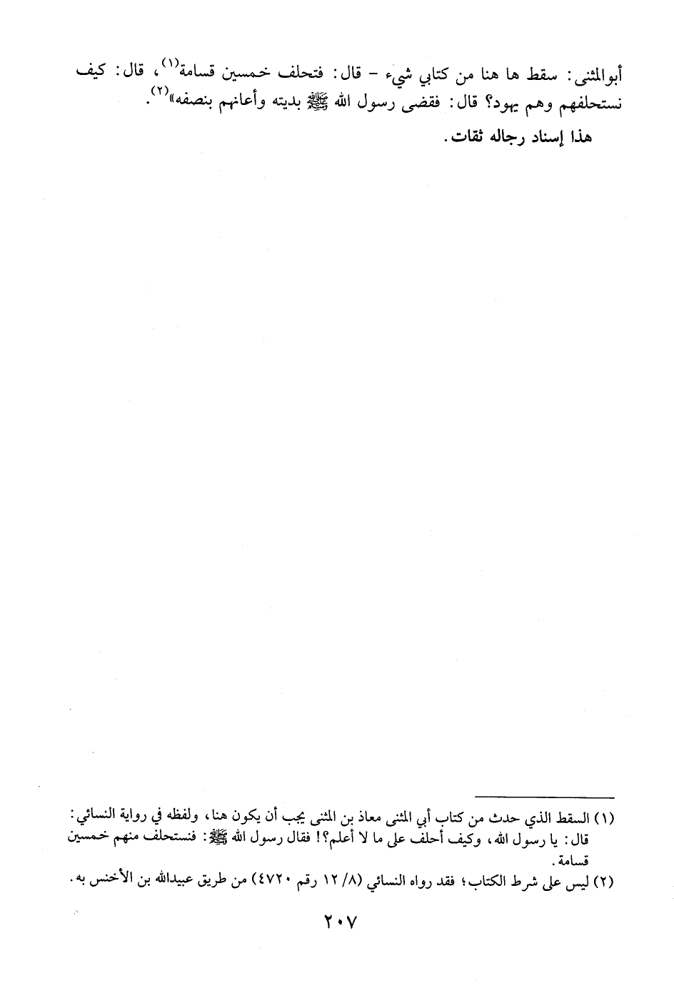 أَبُو الْمُثَنَّى: سَقَطَ هَا هُنَا مِنْ كِتَابِي شيء- قال: فتحلف خمسين قسامة قال: كيف نستحلفهم وَهُمْ يَهُودٌ؟ قَالَ: فَقَضَى رَسُولُ اللَّهِ - صَلَّى اللَّهُ عَلَيْهِ وَسَلَّمَ - بِدِيَتِهِ وَأَعَانَهُمْ بِنِصْفِهِ} .