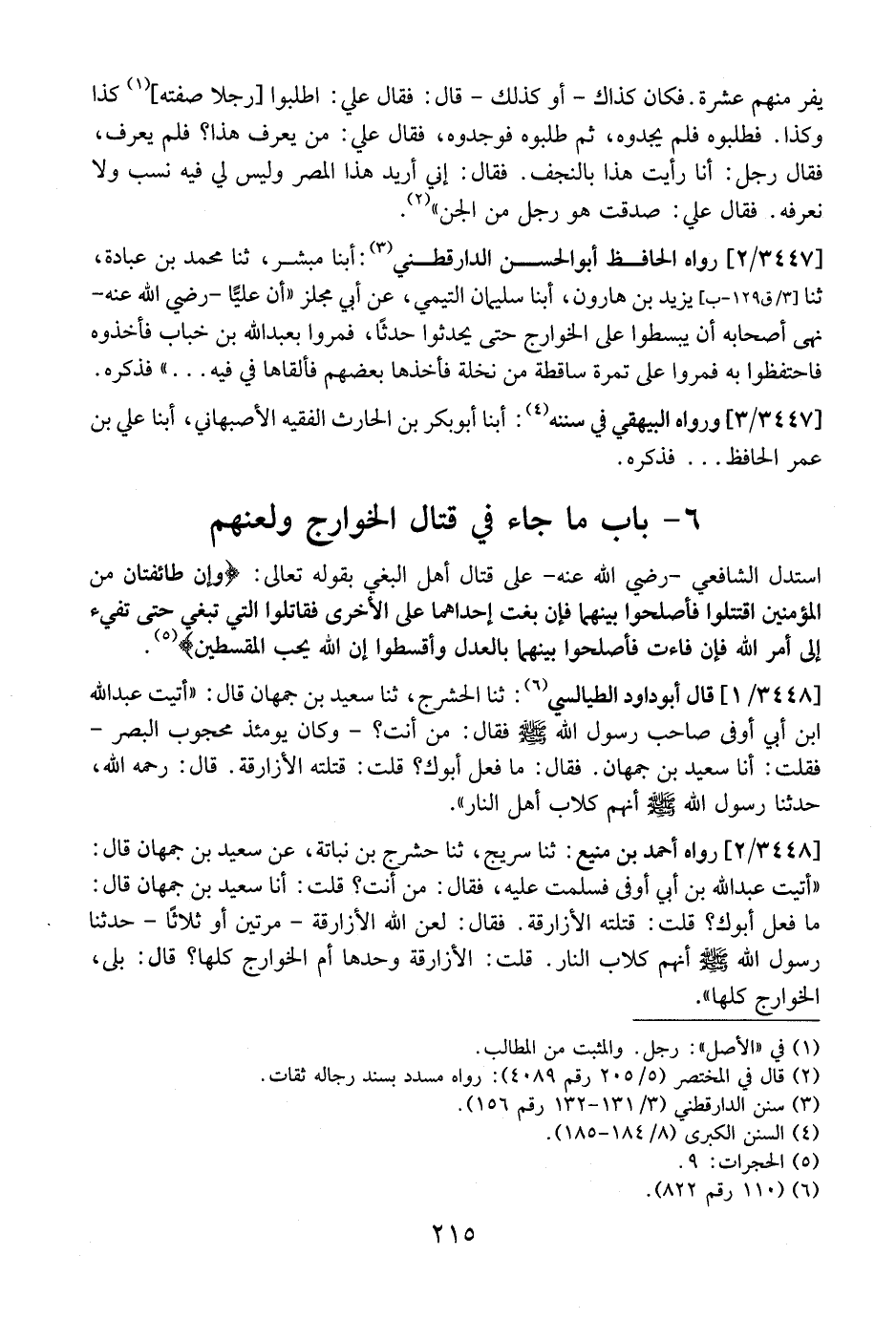 3448 / 2 - - رَوَاهُ أَحْمَدُ بْنُ مَنِيعٍ: ثنا سُرَيْجٌ، ثنا حَشْرَجُ بْنُ نَبَاتَةَ، عَنْ سَعِيدِ بْنِ جُمْهَانَ قَالَ: {أَتَيْتُ عَبْدَ اللَّهِ بْنَ أَبِي أَوْفَى فَسَلَّمْتُ عَلَيْهِ، فَقَالَ: مَنْ أَنْتَ؟ قُلْتُ: أَنَا سَعِيدُ بْنُ جُمْهَانَ قَالَ: مَا فَعَلَ أَبُوكَ؟ قُلْتُ: قَتَلَتْهُ الْأَزَارِقَةُ. فَقَالَ: لَعَنَ اللَّهُ الْأَزَارِقَةَ- مَرَّتَيْنِ أَوْ ثَلَاثًا- حَدَّثَنَا رَسُولُ اللَّهِ - صَلَّى اللَّهُ عَلَيْهِ وَسَلَّمَ - أنهم كلاب النَّارِ. قُلْتُ: الْأَزَارِقَةُ وَحْدَهَا أَمِ الْخَوَارِجُ كُلُّهَا؟ قال: بلى، الخوارج كلها} .
