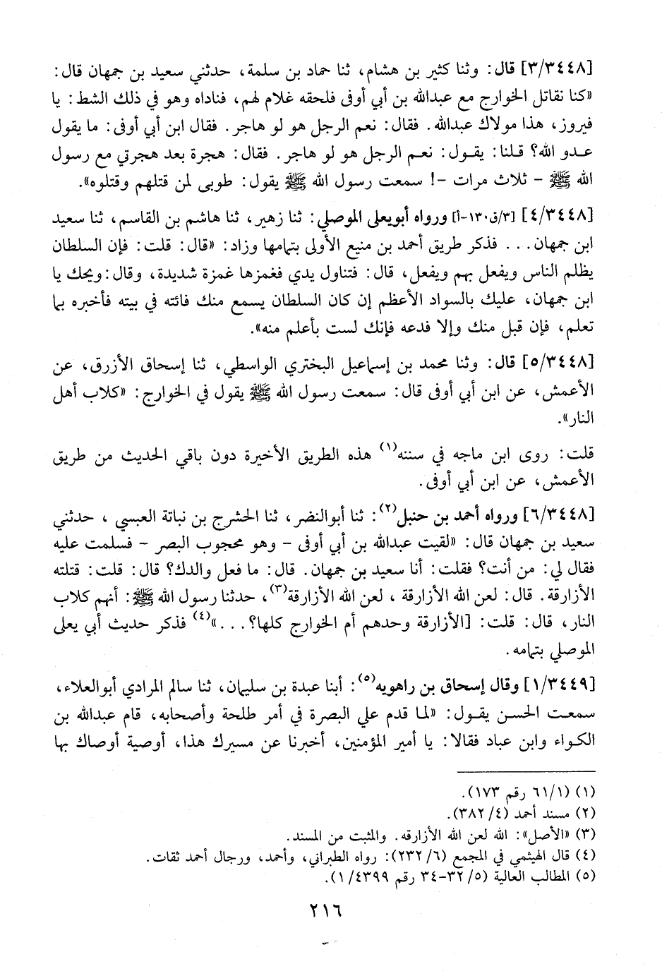 3448 / 6 - - وَرَوَاهُ أَحْمَد بْن حَنْبَلٍ: ثَنَا أَبُو النَّضْر، ثنا الحشرج بن نباتة العبسي، حدثني حعيد بْنُ جُمْهَانَ قَالَ: {لَقِيتُ عَبْدَ اللَّهِ بْنَ أَبِي أَوْفَى- وَهُوَ مَحْجُوبُ الْبَصَرِ- فَسَلَّمْتُ عَلَيْهِ فقال لي: من أنت؟ فقلت: أَنَا سَعِيدُ بْنُ جُمْهَانَ. قَالَ: مَا فَعَلَ والدك؟ قال: قُلْتُ: قَتَلَتْهُ الْأَزَارِقَةُ. قَالَ: لَعَنَ اللَّهُ الْأَزَارِقَةَ، لَعَنَ اللَّهُ الْأَزَارِقَةَ حَدَّثَنَا رَسُولُ اللَّهِ- صَلَّى اللَّهُ عَلَيْهِ وَسَلَّمَ -: أنهم كلاب النَّارِ، قَالَ: قُلْتُ: الْأَزَارِقَةُ وَحْدَهُمْ أَمِ الْخَوَارِجُ كلها؟ ... } فذكر حديث أبي يَعْلَى الْمَوْصِلِيُّ بِتَمَامِهِ.