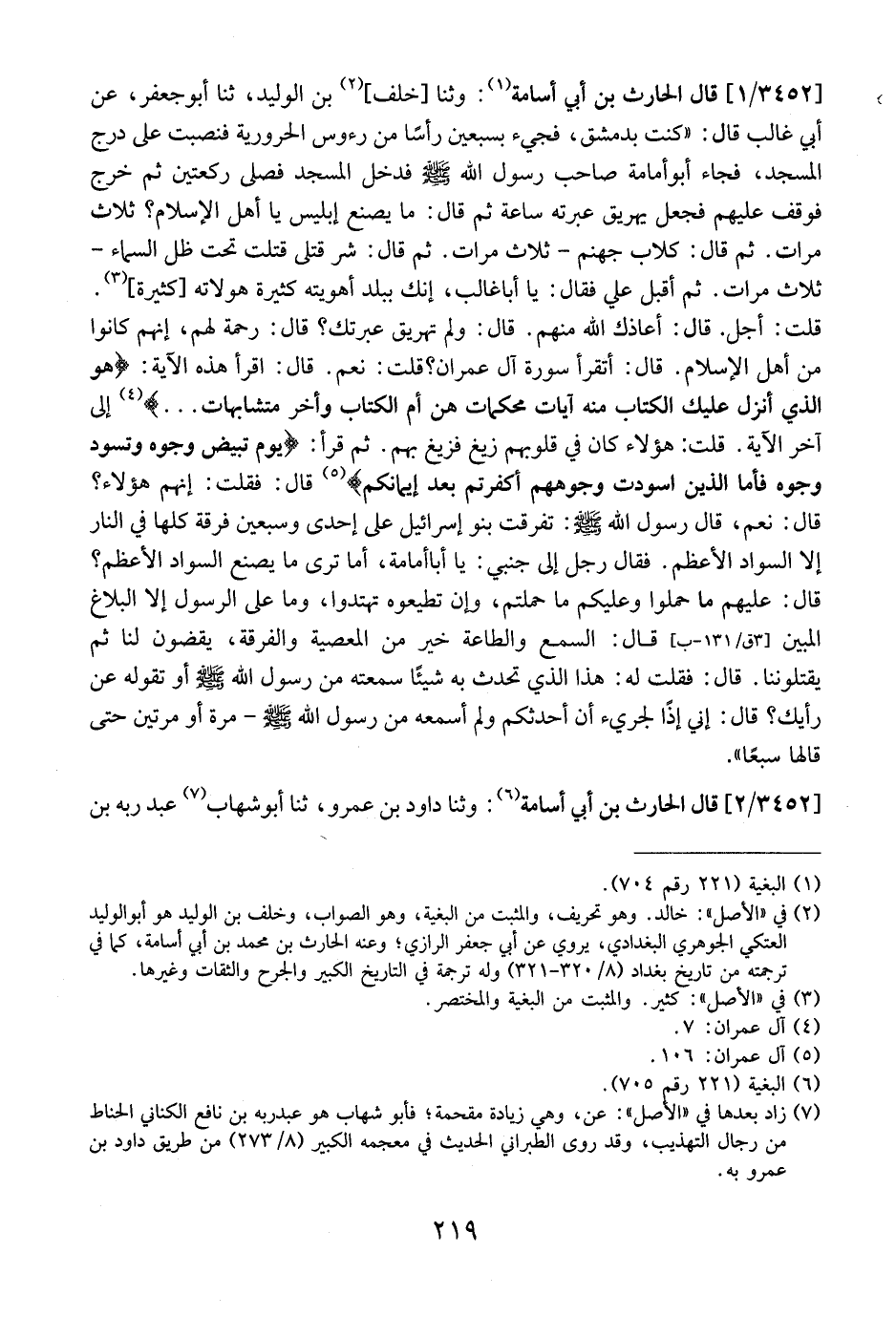 3452 / 1 - - قال الحارث بن أبي أسامة: وَثَنَا خَلَفُ بْنُ الْوَلِيدِ، ثَنَا أَبُو جَعْفَرٍ، عَنْ أَبِي غَالِبٍ قَالَ: {كُنْتُ بِدِمَشْقَ، فَجِيءَ بِسَبعْينَ رَأْسًا مِنْ رُءُوسِ الْحَرُورِيَّةِ فَنُصِبَتْ عَلَى دَرَجِ الْمَسْجِدِ، فَجَاءَ أَبُو أُمَامَةَ صَاحِبُ رَسُولِ اللَّهِ - صَلَّى اللَّهُ عَلَيْهِ وَسَلَّمَ - فَدَخَلَ الْمَسْجِدَ فَصَلَّى رَكْعَتَيْنِ ثُمَّ خَرَجَ فَوَقَفَ عَلَيْهِمْ فَجَعَلَ يَهْرِيقُ عَبْرَتَهُ سَاعَةً ثُمَّ قَالَ: مَا يَصْنَعُ إِبْلِيسُ يَا أَهْلَ الْإِسَلَامِ؟ ثَلَاثَ مَرَّاتٍ. ثُمَّ قَالَ: كِلَابُ جَهَنَّمَ- ثَلَاثَ مَرَّاتٍ. ثُمَّ قَالَ: شَرُّ قَتْلَى قُتِلَتْ تَحْتَ ظِلِّ السَّمَاءِ- ثَلَاثَ مَرَّاتٍ. ثم أقبل علي فقال: يا أباغالب، إنك ببلد أهويته كثيرة هولاته كثيرة. قُلْتُ: أَجَلْ. قَالَ: أَعَاذَكَ اللَّهُ مِنْهُمْ. قَالَ: ولم تهريق عبرتك؟ قالت: رحمة لهم، إنهم كانوا من أَهْلَ الْإِسَلَامِ. قَالَ: أَتَقْرَأُ سُورَةَ آلِ عِمْرَانَ؟ قُلْتُ: نَعَمْ. قَالَ: اقْرَأْ هَذِهِ الْآيَةَ: ?هُوَ الَّذِي أَنْزَلَ عَلَيْكَ الْكِتَابَ مِنْهُ آيَاتٌ مُحْكَمَاتٌ هن أم الكتاب وأخر متشابهات ... ? إِلَى آخِرِ الْآيَةِ. قُلْتُ: هَؤُلَاءِ كَانَ فِي قُلُوبِهِمْ زَيْغٌ فَزِيغَ بِهِمْ. ثُمَّ قَرَأَ: ?يَوْمَ تَبْيَضُّ وُجُوهٌ وَتَسْوَدُّ وُجُوهٌ فَأَمَّا الَّذِينَ اسْوَدَّتْ وجوههم أكفرتم بعد إيمانكم ?قَالَ: فَقُلْتُ: إِنَّهُمْ هَؤُلَاءِ؟ قَالَ: نَعَمْ، قَالَ رَسُولُ اللَّهِ- صَلَّى اللَّهُ عَلَيْهِ وَسَلَّمَ -: تَفَرَّقَتْ بَنُو إِسْرَائِيلَ عَلَى إِحْدَى وَسَبْعِينَ فِرْقَةً كُلُّهَا فِي النَّارِ إِلَّا السَّوَادَ الْأَعْظَمَ. فَقَالَ رَجُلٌ إلى جَنْبِي: يَا أَبَا أُمَامَةَ، أَمَا تَرَى مَا يصنع السواد الأعظم؟ قال: عليهم ماحملوا وعليكم ما حملتم، وإن تطيعوه تهتدوا، وما على الرسول إلا البلاع الْمُبِينُ قَالَ: السَّمْعُ وَالطَّاعَةُ خَيْرٌ مِنَ الْمَعْصِيَةِ وَالْفُرْقَةِ، يَقْضُونَ لَنَا ثُمَّ يَقْتُلُونَنَا. قَالَ: فَقُلْتُ لَهُ: هَذَا الَّذِي تُحَدِّثُ بِهِ شَيْئًا سَمِعْتُهُ مِنْ رَسُولِ اللَّهِ - صَلَّى اللَّهُ عَلَيْهِ وَسَلَّمَ - أَوْ تَقُولُهُ عَنْ رَأْيِكَ؟ قَالَ: إِنِّي إِذًا لَجَرِيءٌ أَنْ أُحَدِّثَكُمْ وَلَمْ أَسْمَعْهُ مِنْ رَسُولِ اللَّهِ - صَلَّى اللَّهُ عَلَيْهِ وَسَلَّمَ - مَرَّةً أَوْ مرتين حتى قالهاسبعًا} .