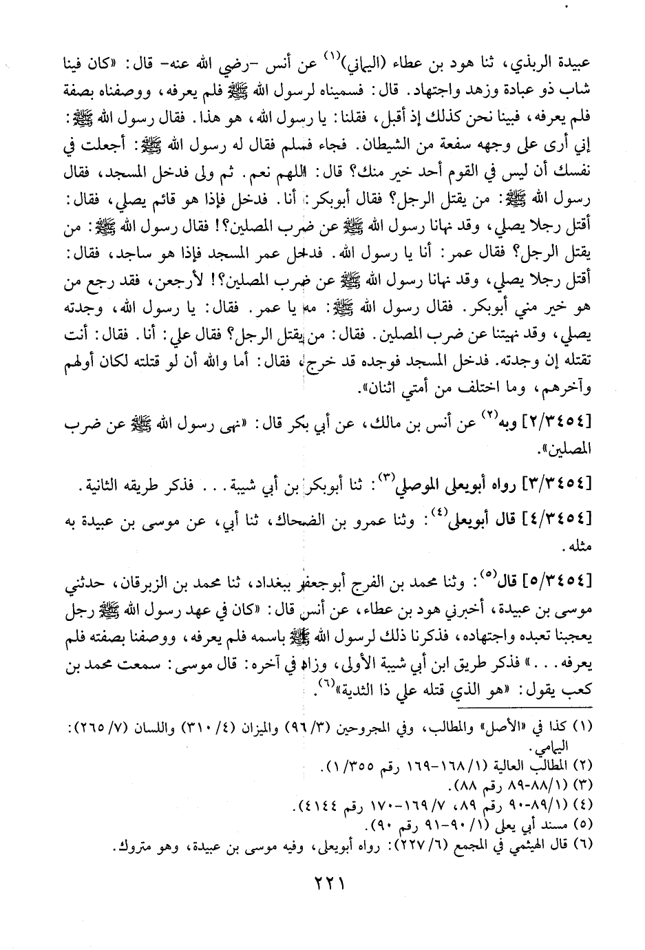 عُبَيْدَةَ الرُّبَذِيُّ، ثنا هُودُ بْنُ عَطَاءٍ (الْيَمَانِيُّ) عَنْ أَنَسٍ- رَضِيَ اللَّهُ عَنْهُ- قَالَ: {كَانَ فِينَا شَابٌّ ذُو عِبَادَةٍ وَزُهْدٍ وَاجْتِهَادٍ. قَالَ: فَسَمَّيْنَاهُ لِرَسُولِ اللَّهِ - صَلَّى اللَّهُ عَلَيْهِ وَسَلَّمَ - فَلَمْ يَعْرِفْهُ، وَوَصَفْنَاهُ بِصِفَةٍ فَلَمْ يَعْرِفْهُ، فَبَيْنَا نَحْنُ كَذَلِكَ إِذْ أَقْبَلَ، فَقُلْنَا: يَا رَسُولَ اللَّهِ، هُوَ هَذَا. فَقَالَ رَسُولُ اللَّهِ- صَلَّى اللَّهُ عَلَيْهِ وَسَلَّمَ -: إِنِّي أَرَى عَلَى وَجْهِهِ سَفْعَةً مِنَ الشَّيْطَانِ. فَجَاءَ فَسَلَّمَ فَقَالَ لَهُ رَسُولُ اللَّهِ- صَلَّى اللَّهُ عَلَيْهِ وَسَلَّمَ -: أَجَعَلْتَ فِي نَفْسِكِ أَنْ لَيْسَ فِي الْقَوْمِ أحد خير مِنْكَ؟ قَالَ: اللَّهُمَّ نَعَمْ. ثُمَّ وَلَّى فَدَخَلَ الْمَسْجِدَ، فَقَالَ رَسُولُ اللَّهِ- صَلَّى اللَّهُ عَلَيْهِ وَسَلَّمَ -: مَنْ يَقْتُلُ الرَّجُلَ؟ فَقَالَ أَبُو بَكْرٍ: أَنَا. فَدَخَلَ فَإِذَا هُوَ قَائِمٌ يُصَلِّي، فَقَالَ: أقتل رجلا يصلي، وقد نَهَانَا رَسُولُ اللَّهِ - صَلَّى اللَّهُ عَلَيْهِ وَسَلَّمَ - عَنْ ضَرْبِ الْمُصَلِّينَ؟! فَقَالَ رَسُولُ اللَّهِ- صَلَّى اللَّهُ عَلَيْهِ وَسَلَّمَ -: مَنْ يَقْتُلُ الرَّجُلَ؟ فَقَالَ عُمَرُ: أَنَا يَا رَسُولَ اللَّهِ. فَدَخَلَ عُمَرُ الْمَسْجِدَ فَإِذَا هُوَ سَاجِدٌ، فَقَالَ: أَقْتُلُ رَجَلًا يُصَلِّي، وَقَدْ نَهَانَا رَسُولُ اللَّهِ - صَلَّى اللَّهُ عَلَيْهِ وَسَلَّمَ - عن ضَرْبِ الْمُصَلِّينَ؟! لَأَرْجِعَنَّ، فَقَدْ رَجَعَ مَنْ هُوَ خَيْرٌ مِنِّي أَبُو بَكْرٍ. فَقَالَ رَسُولُ اللَّهِ- صَلَّى اللَّهُ عَلَيْهِ وَسَلَّمَ -: مَهْ يَا عُمَرُ. فَقَالَ: يَا رَسُولَ اللَّهِ، وَجَدْتُهُ يُصَلِّي، وَقَدْ نهيتنا عن ضرب المصلين. فقال: مَنْ يَقْتُلُ الرَّجُلَ؟ فَقَالَ عَلِيٌّ: أَنَا. فَقَالَ: أَنْتَ تَقْتُلُهُ إِنْ وَجَدْتَهُ. فَدَخَلَ الْمَسْجِدَ فَوَجَدَهُ قَدْ خَرَجَ، فَقَالَ: أَمَا وَاللَّهِ أَنْ لَوْ قَتَلْتَهُ لَكَانَ أَوَّلَهَمُ وَآخِرَهُمْ، وَمَا اخْتَلَفَ مِنْ أُمَّتِي اثْنَانِ} .