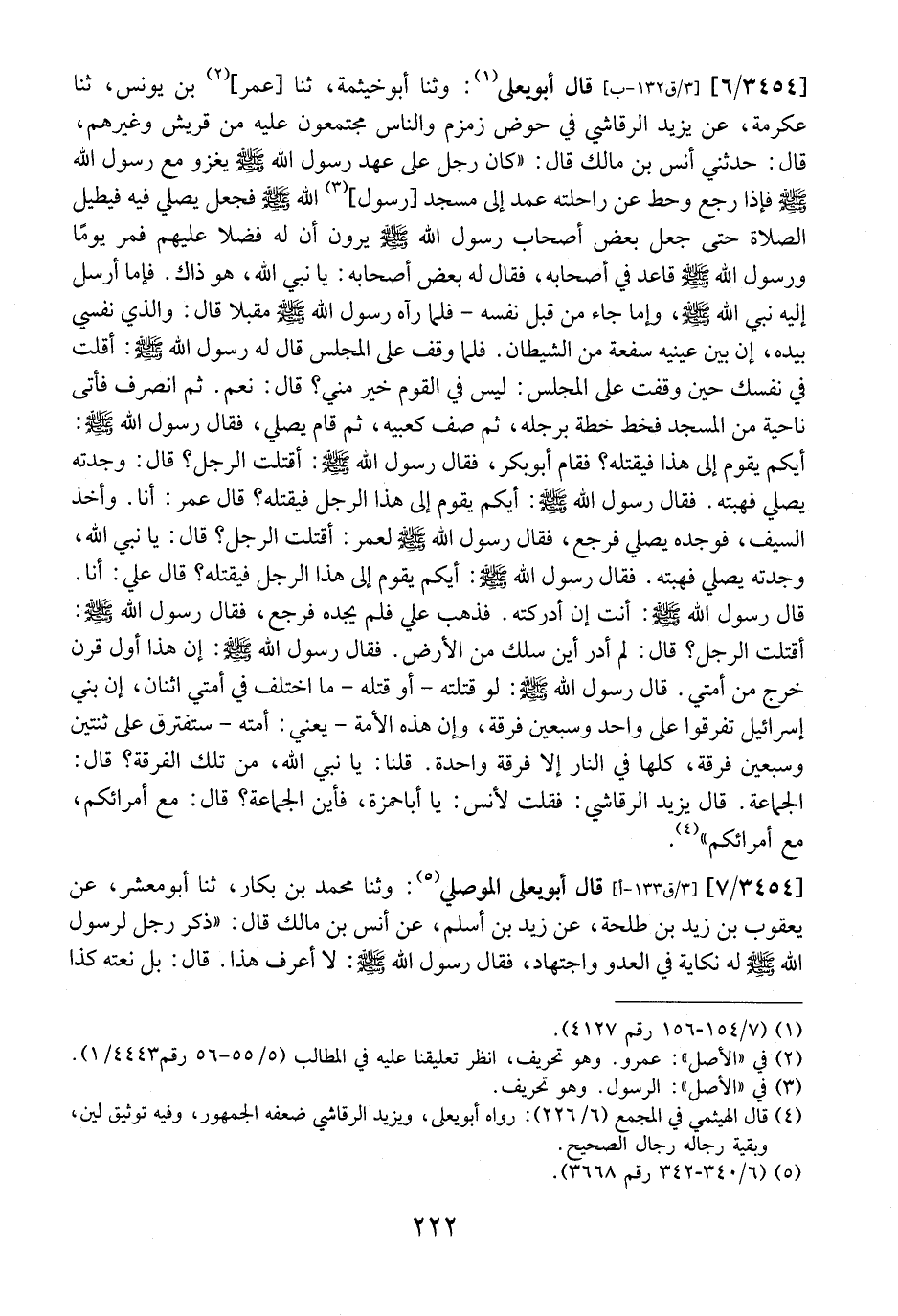 3454 / 6 - - قَالَ أَبُو يَعْلَى: وَثَنَا أَبُو خَيْثَمَةَ، ثَنَا عمربن يُونُسَ، ثنا عِكْرِمَةُ، عَنْ يَزِيدَ الرَّقَاشِيِّ فِي حَوْضِ زَمْزَمٍ وَالنَّاسُ مُجْتَمِعُونَ عَلَيْهِ مِنْ قُرَيْشٍ وَغَيْرِهِمْ، قَالَ: حَدَّثَنِي أَنَسُ بْنُ مَالِكٍ قَالَ: {كَانَ رَجُلٌ عَلَى عَهْدِ رَسُولِ اللَّهِ - صَلَّى اللَّهُ عَلَيْهِ وَسَلَّمَ - يَغْزُو مَعَ رَسُولِ اللَّهِ - صَلَّى اللَّهُ عَلَيْهِ وَسَلَّمَ - فَإِذَا رَجَعَ وَحَطَّ عَنْ رَاحِلَتِهِ عَمِدَ إِلَى مَسْجِدِ رَسُولِ اللَّهِ - صَلَّى اللَّهُ عَلَيْهِ وَسَلَّمَ - فَجَعَلَ يُصَلِّي فِيهِ فَيُطِيلُ الصَّلَاةَ حَتَّى جَعَلَ بَعْضُ أَصْحَابِ رَسُولِ اللَّهِ - صَلَّى اللَّهُ عَلَيْهِ وَسَلَّمَ - يَرَوْنَ أَنَّ لَهُ فَضْلًا عَلَيْهِمْ فَمَرَّ يَوْمًا وَرَسُولُ اللَّهِ - صَلَّى اللَّهُ عَلَيْهِ وَسَلَّمَ - قَاعِدٌ فِي أَصْحَابِهِ، فقال له بعض أصحابه: يا نبي الله، هُوَ ذَاكَ. فَإِمَّا أَرْسَلَ إِلَيْهِ نَبِيُّ اللَّهِ - صَلَّى اللَّهُ عَلَيْهِ وَسَلَّمَ - وَإِمَّا جَاءَ مِنْ قبل نفسه- فلما رآه رسول الله عن مُقْبِلًا قَالَ: وَالَّذِي نَفْسِي بِيَدِهِ، إِنَّ بَيْنَ عَيْنَيْهِ سَفْعَةً مِنَ الشَّيْطَانِ. فَلَمَّا وَقَفَ عَلَى الْمَجْلِسِ قَالَ لَهُ رَسُولُ اللَّهِ- صَلَّى اللَّهُ عَلَيْهِ وَسَلَّمَ -: أَقُلْتَ فِي نَفْسِكَ حِينَ وَقَفْتَ عَلَى الْمَجْلِسِ: لَيْسَ فِي الْقَوْمِ خَيْرٌ مِنِّي؟ قال: نعم. ثم انصرف فأتى ناحية من الْمَسْجِدِ فَخَطَّ خِطَّةً بِرِجْلِهِ، ثُمَّ صَفَّ كَعْبَيْهِ، ثُمَّ قَامَ يُصَلِّي، فَقَالَ رَسُولُ اللَّهِ- صَلَّى اللَّهُ عَلَيْهِ وَسَلَّمَ -: أَيُّكُمْ يَقُومُ إِلَى هَذَا فَيَقْتُلُهُ؟ فَقَامَ أَبُو بَكْرٍ، فَقَالَ رَسُولُ اللَّهِ - صَلَّى اللَّهُ عَلَيْهِ وَسَلَّمَ -: أَقَتَلْتَ الرَّجُلَ؟ قَالَ: وَجَدْتُهُ يُصَلِّي فَهِبْتُهُ. فَقَالَ رَسُولُ اللَّهِ- صَلَّى اللَّهُ عَلَيْهِ وَسَلَّمَ -: أَيُّكُمْ يَقُومُ إِلَى هَذَا الرَّجُلِ فَيَقْتُلُهُ؟ قَالَ عُمَرُ: أَنَا. وَأَخَذَ السَّيْفَ، فَوَجَدَهُ يُصَلِّي فَرَجَعَ، فَقَالَ رَسُولُ اللَّهِ - صَلَّى اللَّهُ عَلَيْهِ وَسَلَّمَ - لِعُمَرَ: أَقَتَلْتَ الرَّجُلَ؟ قَالَ: يَا نَبِيَّ اللَّهِ، وَجَدْتُهُ يُصَلِّي فَهِبْتُهُ. فَقَالَ رَسُولُ اللَّهِ- صَلَّى اللَّهُ عَلَيْهِ وَسَلَّمَ -: أَيُّكُمْ يَقُومُ إِلَى هَذَا الرَّجُلِ فَيَقْتُلُهُ؟ قَالَ عَلِيٌّ: أَنَا. قَالَ رَسُولُ اللَّهِ- صَلَّى اللَّهُ عَلَيْهِ وسلم -: أنت إن أدركته. فذهب علي فَلَمْ يَجِدْهُ فَرَجَعَ، فَقَالَ رَسُولُ اللَّهِ- صَلَّى اللَّهُ عَلَيْهِ وَسَلَّمَ -: أَقَتَلْتَ الرَّجُلَ؟ قَالَ: لَمْ أدر أين سلك مِنَ الْأَرْضِ. فَقَالَ رَسُولُ اللَّهِ- صَلَّى اللَّهُ عَلَيْهِ وَسَلَّمَ -: إِنَّ هَذَا أَوَّلُ قَرْنٍ خَرَجَ مِنْ أُمَّتِي. قَالَ رَسُولُ اللَّهِ- صَلَّى اللَّهُ عَلَيْهِ وَسَلَّمَ -: لَوْ قَتَلْتُهُ- أَوْ قَتَلَهُ- مَا اخْتَلَفَ فِي أُمَّتِي اثْنَانِ، إِنَّ بَنِي إِسْرَائِيلَ تَفَرَّقُوا عَلَى وَاحِدٍ وَسَبْعِينَ فِرْقَةً، وَإِنَّ هَذِهِ الأمة- يعني: أمته- سَتَفْتَرِقُ عَلَى ثِنْتَيْنِ وَسَبْعِينَ فِرْقَةً، كُلُّهَا فِي النار إلا فرقة واحدة. قلنا: يا نبي اللَّهِ، مَنْ تِلْكَ الْفِرْقَةُ؟ قَالَ: الْجَمَاعَةُ. قَالَ يزيد الرقاشي: فقلت لأنس: يا أباحمزة، فَأَيْنَ الْجَمَاعَةُ؟ قَالَ: مَعَ أُمَرَائِكُمْ، مَعَ أُمَرَائِكُمْ} .