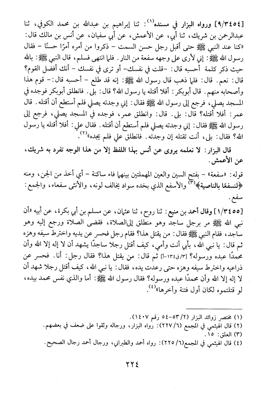 3454 / 9 - - ورواه البزار مُسْنَدِهِ: ثنا إِبْرَاهِيمُ بْنُ عَبْدِ اللَّهِ بْنِ مُحَمَّدٍ الْكُوفِيُّ، ثنا عَبْدُ الرَّحْمَنِ بْنُ شَرِيكٍ، ثنا أَبِي، عَنِ الْأَعْمَشِ، عَنْ أَبِي سُفْيَانَ، عَنْ أَنَسٍ بْنِ مَالِكٍ قَالَ: {كُنَّا عِنْدَ النَّبِيِّ - صَلَّى اللَّهُ عَلَيْهِ وَسَلَّمَ - حَتَّى أَقْبَلَ رَجُلٌ حَسَنَ السَّمْتِ- ذَكَرُوا مِنْ أَمْرِهِ أَمْرًا حَسَنًا- فَقَالَ رَسُولُ اللَّهِ- صَلَّى اللَّهُ عَلَيْهِ وَسَلَّمَ -: إِنِّي لَأَرَى عَلَى وَجْهِهِ سَفْعَةً مِنَ النَّارِ. فَلَمَّا انْتَهَى فَسَلَّمَ، قَالَ النَّبِيُّ- صَلَّى اللَّهُ عَلَيْهِ وَسَلَّمَ -: بِاللَّهِ حَيْثُ ذَكَرَ كَلِمَةً أَحْسَبُهُ قَالَ: - قُلْتَ فِي نَفْسِكِ- أَوَ تَرَى فِي نَفْسِكِ- أَنَّكَ أَفْضَلُ الْقَوْمِ؟ قَالَ: نَعَمْ. قَالَ: فَلَمَّا ذَهَبَ قَالَ رَسُولُ اللَّهِ- صَلَّى اللَّهُ عَلَيْهِ وَسَلَّمَ -: أَنَّهُ قَدْ طَلَعَ- أَحْسَبُهُ قَالَ: - قَوْمُ هَذَا وَأَصَحَابِهِ مِنْهُمْ. قَالَ أَبُو بَكْرٍ: أَفَلَا أَقْتُلُهُ يَا رَسُولَ اللَّهِ؟ قَالَ: بَلَى. فَانْطَلَقَ أَبُو بَكْرٍ فَوَجَدَهُ فِي الْمَسْجِدِ يُصَلِّي، فَرَجَعَ إِلَى رَسُولِ اللَّهِ - صَلَّى اللَّهُ عَلَيْهِ وَسَلَّمَ - فَقَالَ: إِنِّي وَجَدْتُهُ يُصَلِّي فَلَمْ أَسْتَطِعْ أَنْ أَقْتُلَهُ. قَالَ عُمَرُ: أَفَلَا أَقْتُلُهُ؟ قال: بلى. قال: وانطلق عُمَرُ، فَوَجَدَهُ فِي الْمَسْجِدِ يُصَلِّي،
