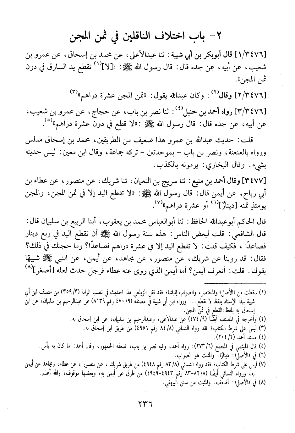 قَالَ الْحَاكِمُ أَبُو عَبْدِ اللَّهِ الْحَافِظُ: ثَنَا أَبُو العباس محمد بن يعقوب، أبنا الرَّبِيعُ بْنُ سُلَيْمَانَ قَالَ: قَالَ الشَّافِعِيُّ: قُلْتُ لبعض الناسك: هَذِهِ سُنَّةِ رَسُولِ اللَّهِ - صَلَّى اللَّهُ عَلَيْهِ وَسَلَّمَ - أَنْ تُقْطَعَ الْيَدُ فِي رُبْعِ دِينَارٍ فَصَاعِدًا، فَكَيْفَ قُلْتَ: لَا تُقْطَعُ الْيَدُ إِلَّا فِي عَشَرَةِ دَرَاهِمَ فَصَاعِدًا؟ وَمَا حُجَّتُكَ فِي ذلك؟ فَقَالَ: قَدْ رَوَيْنَا عَنْ شَرِيكٍ، عَنْ مَنْصُورٍ، عن مجاهد، عن أيمن، عن النبي - صَلَّى اللَّهُ عَلَيْهِ وَسَلَّمَ - شَبِيهًا بِقَوْلِنَا. قُلْتُ: أَتَعْرِفُ أَيْمَنَ؟ أَمَّا أَيْمَنُ الَّذِي رَوَى عَنْهُ عَطَاءٌ فَرَجُلٌ حَدَثٌ لَعَلَّهُ أَصْغَرُ