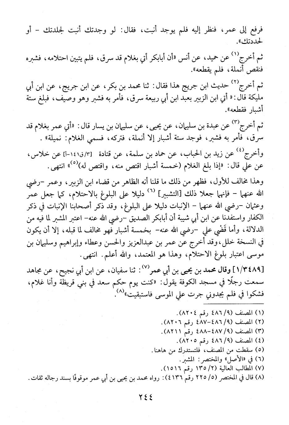 ثم أخرج عن حميد، عن أنسى {أن أبابكر أَتَى بِغُلَامٍ قَدْ سَرَقَ، فَلَمْ يَتَبَيَّنِ احْتِلَامِهِ، فَشَبَرَهُ فَنَقَصَ أَنْمُلَةً، فَلَمْ يَقْطَعْهُ} .