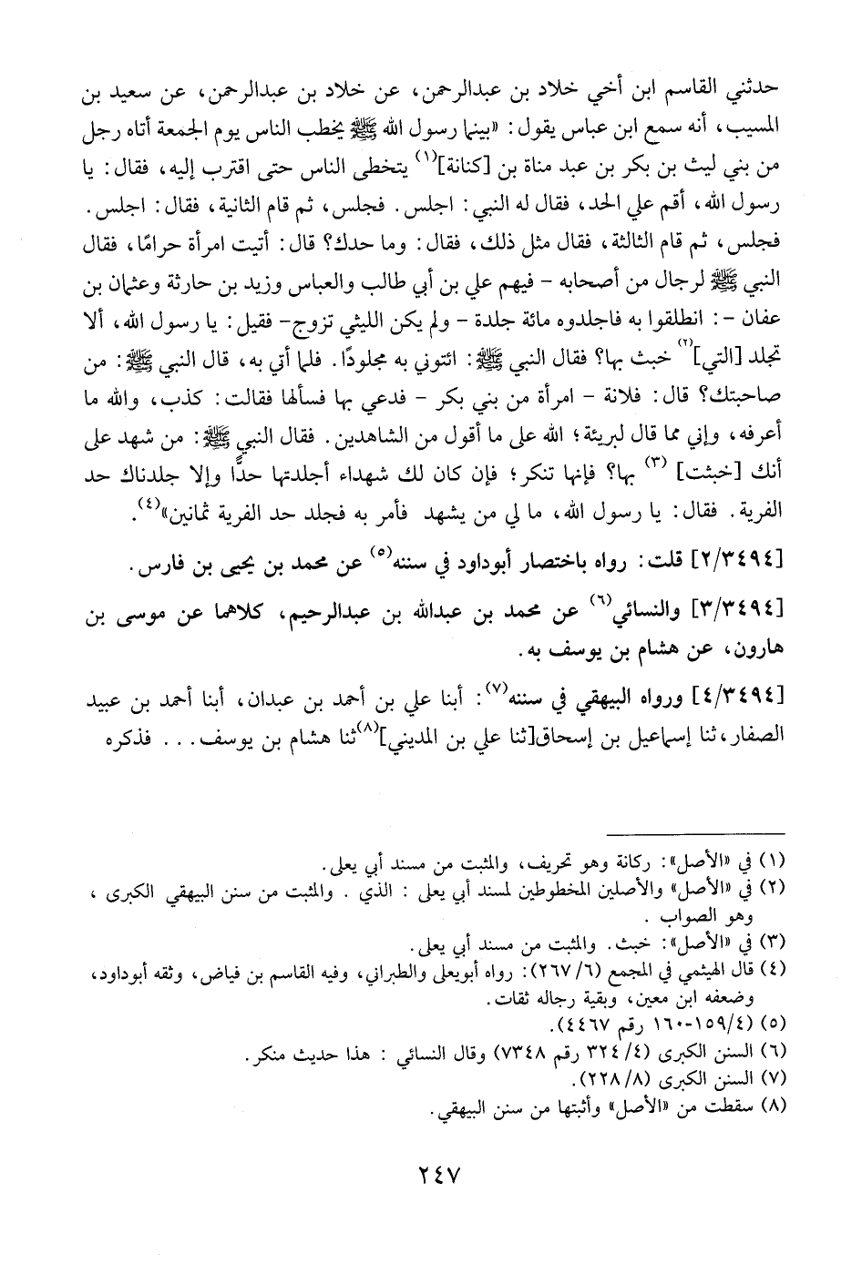 حدثني القاسم ابن أَخِي خَلَّادِ بْنِ عَبْدِ الرَّحْمَنِ، عَنْ خَلَّادِ بْنِ عَبْدِ الرَّحْمَنِ، عَنْ سَعِيدِ بْنِ الْمُسَيِّبِ، أَنَّهُ سَمِعَ ابْنَ عَبَّاسٍ يَقُولُ: {بَيْنَمَا رَسُولَ اللَّهِ - صَلَّى اللَّهُ عَلَيْهِ وَسَلَّمَ - يَخْطُبُ النَّاسَ يَوْمَ الْجُمُعَةِ أَتَاهُ رَجُلٌ مِنْ بَنِي لَيْثِ بْنِ بَكْرِ بْنِ عَبْدِ مَنَاةَ بْنِ كِنَانَةَ، يَتَخَطَّى النَّاسَ حَتَّى اقْتَرَبَ إِلَيْهِ، فَقَالَ: يَا رَسُولَ اللَّهِ، أَقِمْ عَلَيَّ الْحَدَّ، فَقَالَ لَهُ النَّبِيُّ - صَلَّى اللَّهُ عَلَيْهِ وَسَلَّمَ -: اجْلِسْ. فَجَلَسَ، ثُمَّ قَامَ الثَّانِيَةَ، فَقَالَ. اجْلِسْ. فَجَلَسَ، ثُمَّ قام الثالثة، فقالت مِثْلَ ذَلِكَ، فَقَالَ. وَمَا حَدُّكَ؟ قَالَ: أَتَيْتُ امْرَأَةً حَرَامًا، فَقَالَ النَّبِيُّ - صَلَّى اللَّهُ عَلَيْهِ وَسَلَّمَ - لِرِجَالٍ مِنْ أَصْحَابِهِ- فِيهِمْ عَلِيُّ بْنُ أَبِي طَالِبٍ وَالْعَبَّاسُ وَزَيْدُ بْنُ حَارِثَةَ وَعُثْمَانُ بْنُ عَفَّانَ-: انْطَلِقُوا بِهِ فَاجْلِدُوهُ مِائَةَ جَلْدَةٍ- وَلَمْ يَكُنِ اللَّيْثِيُّ تَزَّوَجَ- فَقِيلَ: يَا رَسُولَ الله، ألا نجلد التي، خَبُثَ بِهَا؟ فَقَالَ النَّبِيُّ - صَلَّى اللَّهُ عَلَيْهِ وَسَلَّمَ -: ائتوني به مجلوداً. فلا أُتِيَ بِهِ، قَالَ النَّبِيَّ - صَلَّى اللَّهُ عَلَيْهِ وَسَلَّمَ -: مَنْ صَاحِبَتُكَ؟ قَالَ: فُلَانَةُ- امْرَأةٌ مِنْ بني بكر- فدعي بِهَا فَسَأَلَهَا فَقَالَتْ: كَذَبَ، وَاللَّهِ مَا أَعْرِفُهُ، وَإِنِّي مِمَّا قَالَ لَبَرِيئَةٌ , اللَّهُ عَلَى مَا أقوله مِنَ الشَّاهِدِينَ. فَقَالَ النَّبِيُّ- صَلَّى اللَّهُ عَلَيْهِ وَسَلَّمَ - مَنْ: من شهد على أنك خبثت بها؟ فإنها تنكر؟ فإن كان لك شهداء أجلدتها حداً وإلا جلدناك حد الفرية. فقال: يا رسول الله، ما لي من يشهد فأمر به فجلد حَدَّ الْفِرْيَةِ ثَمَانِينَ} .