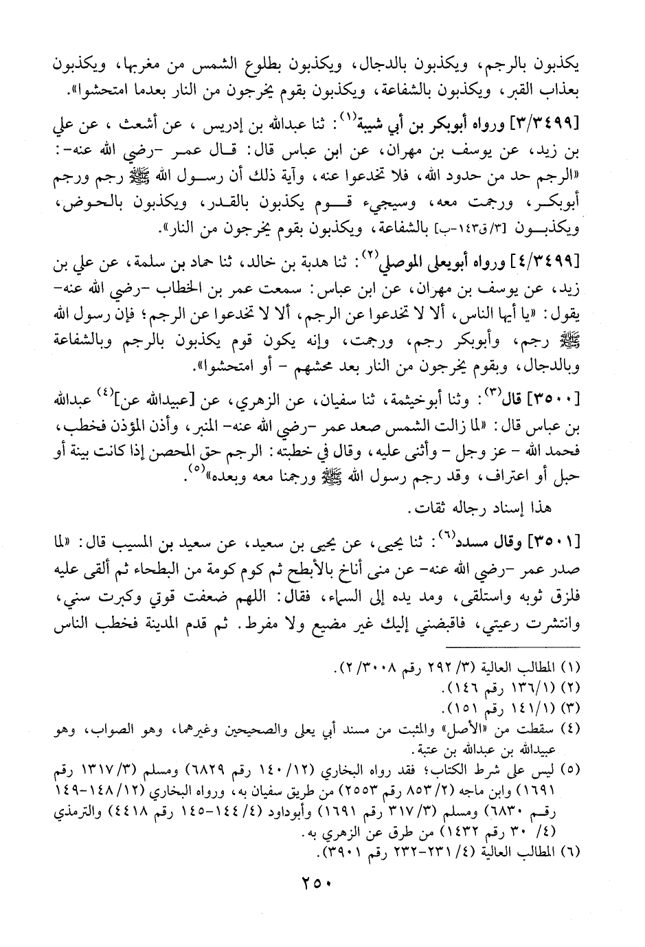 3499 / 4 - - وَرَوَاهُ أَبُو يَعْلَى الْمَوْصِلِيُّ: ثَنَا هُدْبَةُ بْنُ خَالِدٍ، ثَنَا حَمَّادُ بْنُ سَلَمَةَ، عَنْ عَلِيِّ بْنِ زَيْدٍ، عَنْ يُوسُفَ بْنِ مِهْرَانَ، عَنِ ابْنِ عَبَّاسٍ: سَمِعْتُ عُمَرَ بْنَ الْخَطَّابِ- رَضِيَ اللَّهُ عَنْهُ- يَقُولُ: {يَا أَيُّهَا النَّاسُ، أَلَا لَا تُخْدَعُوا عَنِ الرَّجْمِ، أَلَا لَا تُخْدَعُوا عَنِ الرَّجْمِ, فَإِنَّ رَسُولَ اللَّهِ - صَلَّى اللَّهُ عَلَيْهِ وَسَلَّمَ - رَجَمَ، وَأَبُو بَكْرٍ رَجَمَ، وَرَجَمْتُ، وَإِنَّهُ يَكُونُ قَوْمٌ يُكَذِّبُونَ بِالرَّجْمِ وَبِالشَّفَاعَةِ وَبِالدَّجَّالِ، وَبِقَوْمٍ يَخْرُجُونَ مِنَ النَّارِ بعد محشهم- أَوِ امْتَحَشُوا} .