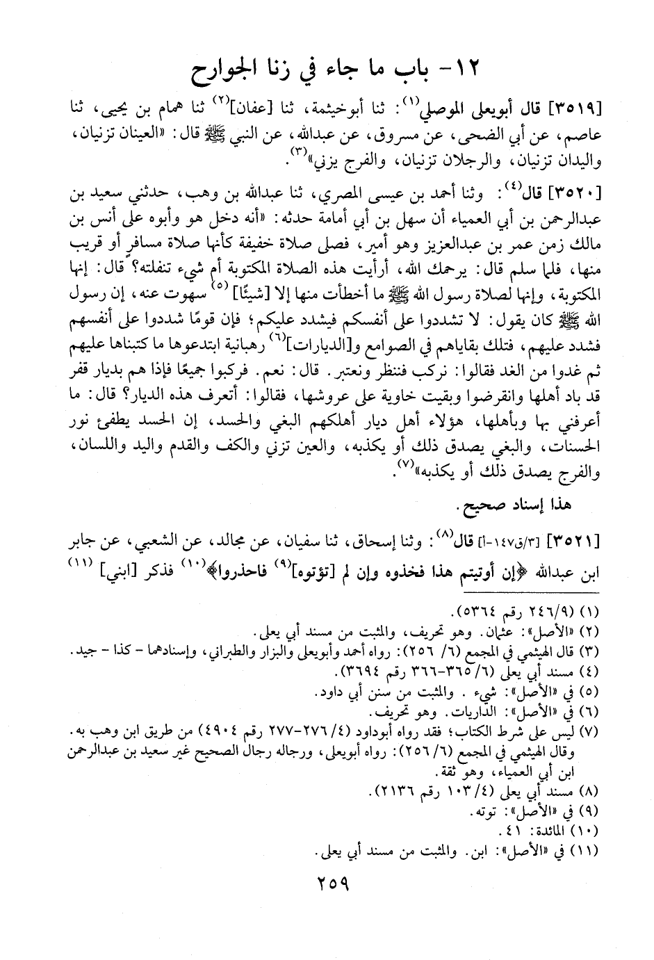 3519 - - قَالَ أَبُو يَعْلَى الْمَوْصِلِيُّ: ثَنَا أَبُو خَيْثَمَةَ، ثنا عفان، ثنا همام بن يحى، ثنا عَاصِمٌ، عَنْ أَبِي الضُّحَى، عَنْ مَسْرُوقٍ، عَنْ عَبْدِ اللَّهِ، عَنِ النَّبِيِّ - صَلَّى اللَّهُ عَلَيْهِ وَسَلَّمَ - قَالَ: {الْعَيْنَانِ تَزْنِيَانِ، وَالْيَدَانِ تَزْنِيَانِ، وَالرِّجْلَانِ تَزْنِيَانِ، وَالْفَرْجُ يَزْنِي} .