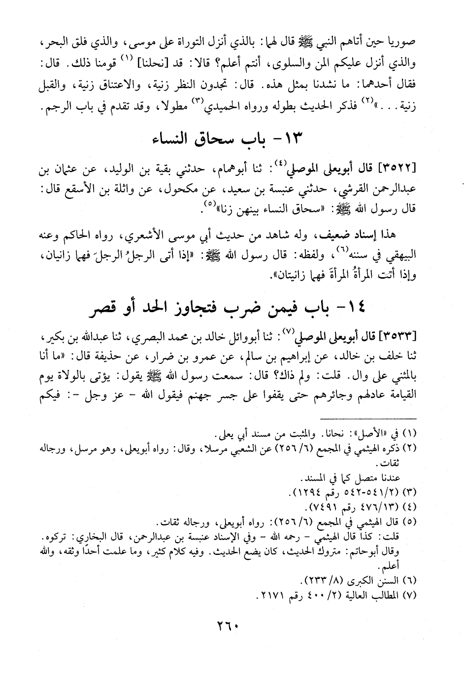 3522 - - قَالَ أَبُو يَعْلَى الْمَوْصِلِيُّ: ثنا أَبُو هَمَّامٍ، حَدَّثَنِي بَقِيَّةُ بْنُ الْوَلِيدِ، عَنْ عُثْمَانَ بْنِ عَبْدِ الرَّحْمَنِ الْقُرَشِيِّ، حَدَّثَنِي عنبسة بْنُ سَعِيدٍ، عَنْ مَكْحُولٍ، عَنْ وَاثِلَةَ بْنِ الْأَسْقَعِ قَالَ: قَالَ رَسُولُ اللَّهِ - صَلَّى اللَّهُ عَلَيْهِ وسلم -: {حاق النِّسَاءِ بَيْنَهُنَّ زِنَا} . هَذَا إِسْنَادٌ ضَعِيفٌ، وَلَهُ شَاهِدٌ مِنْ حَدِيثِ أبو مُوسَى الْأَشْعَرِيِّ، رَوَاهُ الْحَاكِمُ وَعَنْهُ الْبَيْهَقِيُّ فِي سُنَنِهِ، وَلَفْظُهُ: قَالَ رَسُولُ اللَّهِ - صَلَّى اللَّهُ عَلَيْهِ وَسَلَّمَ -: {إِذَا أَتَى الرَّجُلُ الرَّجُلَ فَهُمَا زَانِيَانِ، وَإِذَا أَتَتِ الْمَرْأَةُ الْمَرْأَةَ فَهُمَا زَانِيَتَانِ} .