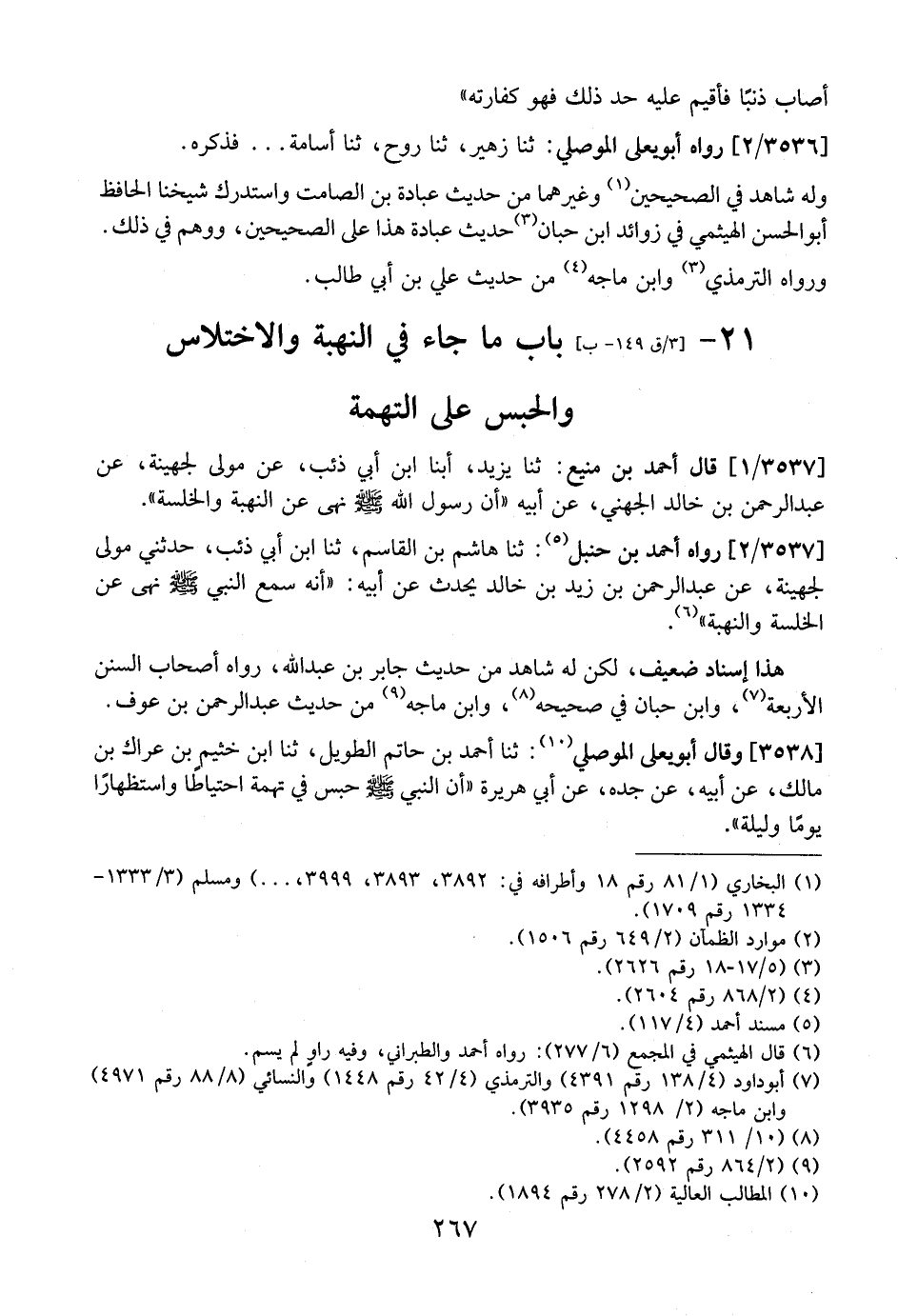 3537 / 1 - - قَالَ أَحْمَدُ بْنُ مَنِيعٍ: ثنا يَزِيدُ، أبنا ابْنُ أَبِي ذِئْبٍ، عَنْ مَوْلًى لِجُهَيْنَةَ، عَنْ عَبْدِ الرَّحْمَنِ بْنِ خَالِدٍ الْجُهَنِيِّ، عَنْ أَبِيهِ {أن رسول الله ل- صَلَّى اللَّهُ عَلَيْهِ وَسَلَّمَ - نَهَى عَنِ النُّهْبَةِ وَالْخُلْسَةِ} .