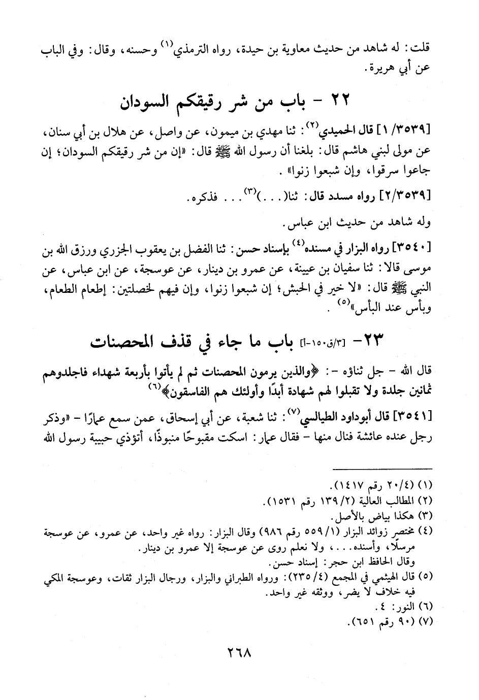 3540 - - رَوَاهُ الْبَزَّارُ فِي مُسْنَدِهِ بِإِسْنَادٍ حَسَنٍ: ثنا الْفَضْلُ بْنُ يَعْقُوبَ الْجَزْرِيُّ وَرِزْقُ اللَّهِ بْنُ مُوسَى قَالَا: ثَنَا سُفْيَانُ بْنُ عُيَيْنَةَ، عَنْ عَمْرِو بْنِ دِينَارٍ، عَنْ عَوْسَجَةَ، عَنِ ابْنِ عَبَّاسٍ، عَنِ النَّبِيِّ - صَلَّى اللَّهُ عَلَيْهِ وَسَلَّمَ - قَالَ: {لَا خَيْرَ فِي الْحَبَشِ، إِنْ شَبِعُوا زَنَوْا، وَإِنَّ فِيهِمْ لَخَصْلَتَيْنِ: إِطْعَامُ الطَّعَامَ، وبأس عِنْدَ الْبَأْسِ} .