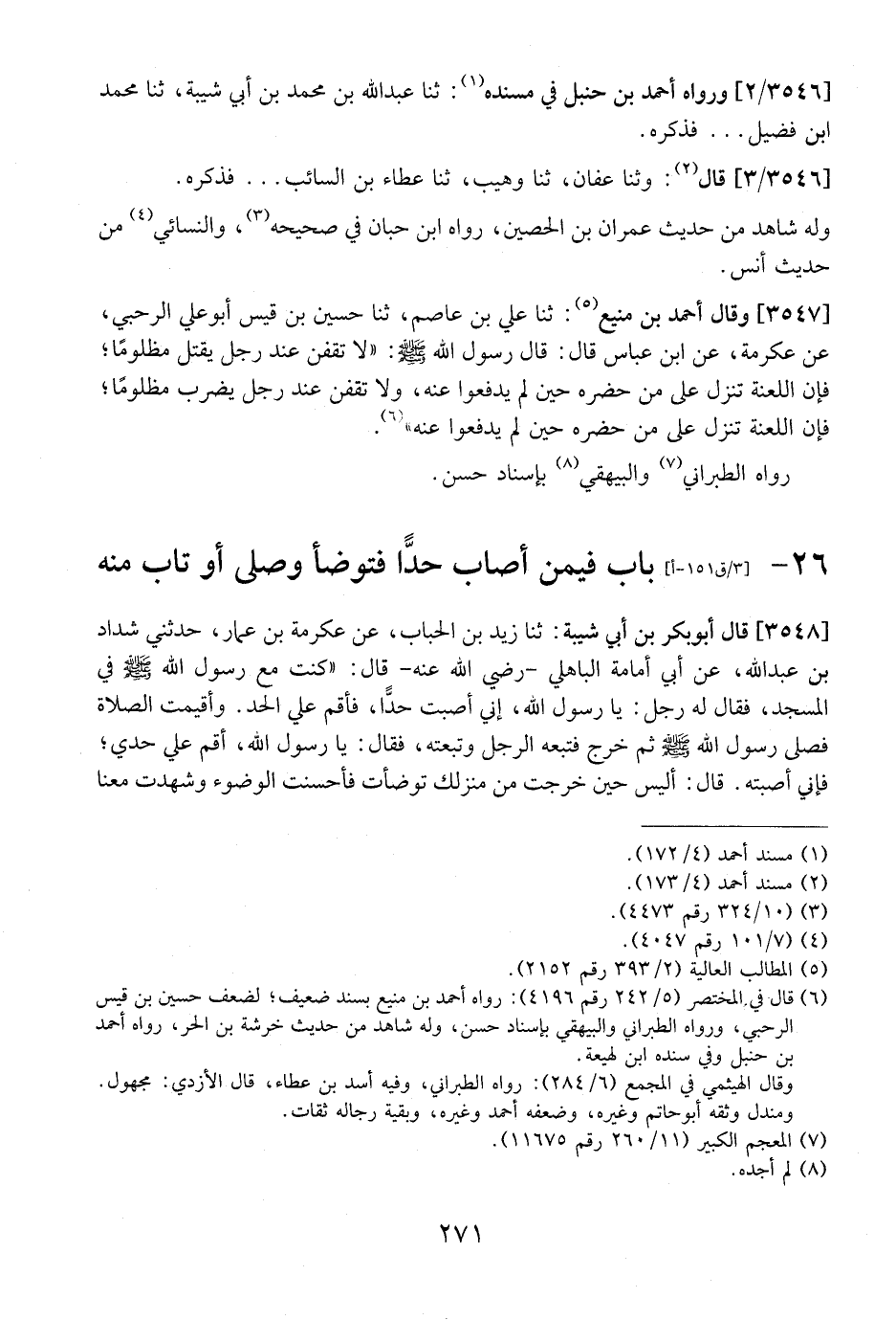 3548 - - قَالَ أَبُو بَكْرِ بْنُ أَبِي شَيْبَةَ: ثَنَا زَيْدُ بْنُ الْحُبَابِ، عَنْ عِكْرِمَةَ بْنِ عَمَّارٍ، حَدَّثَنِي شَدَّادُ بْنُ عَبْدِ اللَّهِ، عَنْ أَبِي أُمَامَةَ الْبَاهِلِيِّ- رَضِيَ اللَّهُ عَنْهُ- قَالَ: {كُنْتُ مَعَ رَسُولِ اللَّهِ - صَلَّى اللَّهُ عَلَيْهِ وَسَلَّمَ - في الْمَسْجِدِ، فَقَالَ لَهُ رَجُلٌ: يَا رَسُولَ اللَّهِ، إِنِّي أَصَبْتُ حَدًّا، فَأَقِمْ عَلَيَّ الْحَدَّ. وَأُقِيمَتِ الصَّلَاةُ فَصَلَّى رَسُولُ اللَّهِ - صَلَّى اللَّهُ عَلَيْهِ وَسَلَّمَ - ثُمَّ خرج تبعه الرُّجُلُ وَتَبَعْتُهُ، فَقَالَ: يَا رَسُولَ اللَّهِ، أَقِمْ عَلَيَّ حَدِّي؟ فَإِنِّي أَصَبْتُهُ. قَالَ: أَلَيْسَ حِينَ خَرَجْتَ مِنْ مَنْزِلِكَ تَوَضَّأْتَ فَأَحْسَنْتَ الْوُضُوءَ وَشَهِدْتَ معنا