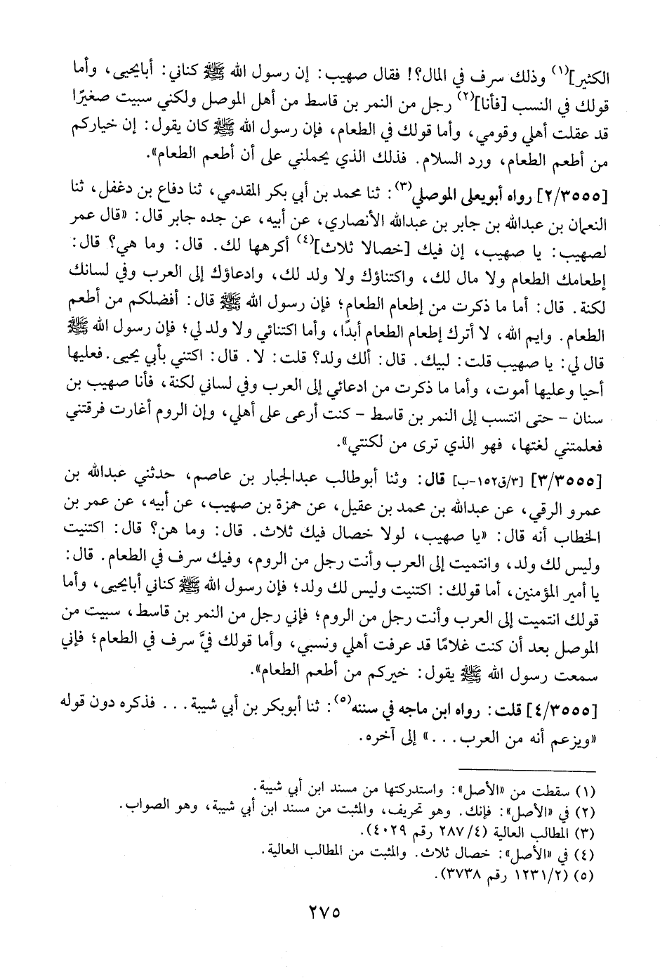 3555 / 2 - - رَوَاهُ أَبُو يَعْلَى الْمَوْصِلِيُّ: ثَنَا مُحَمَّدُ بْنُ أَبِي بَكْرٍ الْمُقَدِّمِيُّ، ثنا دِفَاعُ بْنُ دَغْفَلٍ، ثنا النُّعْمَانُ بْنُ عَبْدِ اللَّهِ بْنِ جَابِرِ بْنِ عَبْدِ اللَّهِ الْأَنْصَارِيِّ، عَنْ أَبِيهِ، عَنْ جَدِّهِ جَابِرٍ قَالَ: "قَالَ عُمَرُ لِصُهَيْبٍ: يا صهيب، إن فيك خصالا ثلاث، أكرهها لك. قال: وما هي؟ قال: إطعامك الطعام وَلَا مَالَ لَكَ، وَاكْتِنَاؤُكَ وَلَا وَلَدَ لَكَ، وادعاؤك إلى العرب وفي لسانك لكنة. قَالَ: أَمَّا مَا ذَكَرْتَ مِنْ إِطْعَامِ الطعامِ؟ فَإِنَّ رَسُولَ اللَّهِ - صَلَّى اللَّهُ عَلَيْهِ وَسَلَّمَ - قَالَ: أَفْضَلُكُمْ مَنْ أَطْعَمَ الطَّعَامَ. وَأَيْمُ اللَّهِ، لا أترك إطعام الطعام أبدَا، وأما اكْتِنَائِي وَلَا وَلَدَ لِي " فَإِنَّ رَسُولَ اللَّهِ - صَلَّى اللَّهُ عَلَيْهِ وَسَلَّمَ - قَالَ لِي: يَا صُهَيْبُ قُلْتُ: لَبَّيْكَ. قَالَ: أَلَكَ وَلَدٌ؟ قُلْتُ: لَا. قَالَ: اكْتَنِي بِأَبِي يَحْيَى. فَعَلَيْهَا أَحْيَا وَعَلَيْهَا أَمْوُتُ، وَأَمَّا مَا ذَكَرْتَ مِنَ ادِّعَائِي إِلَى الْعَرَبِ وَفِي لِسَانِي لُكْنَةٌ، فَأَنَا صُهَيْبُ بْنُ سِنَانٍ- حَتَّى أَنْتَسِبَ إِلَى النَّمِرِ بْنِ قَاسِطٍ- كُنْتُ أَرْعَى عَلَى أَهْلِي، وَإِنَّ الرُّومَ أغارت فرقتني فعلمتني لُغَتُهَا، فَهُوَ الَّذِي تَرَى مِنْ لُكْنَتِي ".