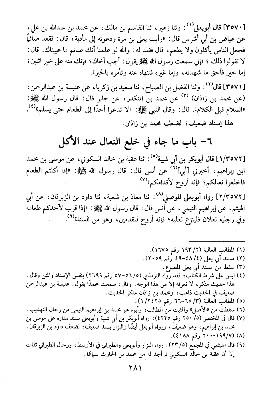 3572 / 2 - - رَوَاهُ أَبُو يَعْلَى الْمَوْصِلِيُّ: ثَنَا مُعَاذُ بْنُ شُعْبَةَ، ثنا دَاوُدُ بْنُ الزِّبْرَقَانِ، عَنْ أَبِي الْهَيْثَمِ، عَنْ إِبْرَاهِيمَ التَّيْمِيِّ، عَنْ أَنَسٍ قَالَ: قَالَ رَسُولُ اللَّهِ- صَلَّى اللَّهُ عَلَيْهِ وسلم -: إِذَا قَرُبَ لِأَحَدِكُمْ طَعَامُهُ وَفِي رِجْلَيْهِ نَعْلَانِ فَلْيَنْزَعْ نَعْلَيْهِ، فَإِنَّهُ أَرْوَحُ لِلْقَدَمَيْنِ، وَهُوَ مِنَ السنة".