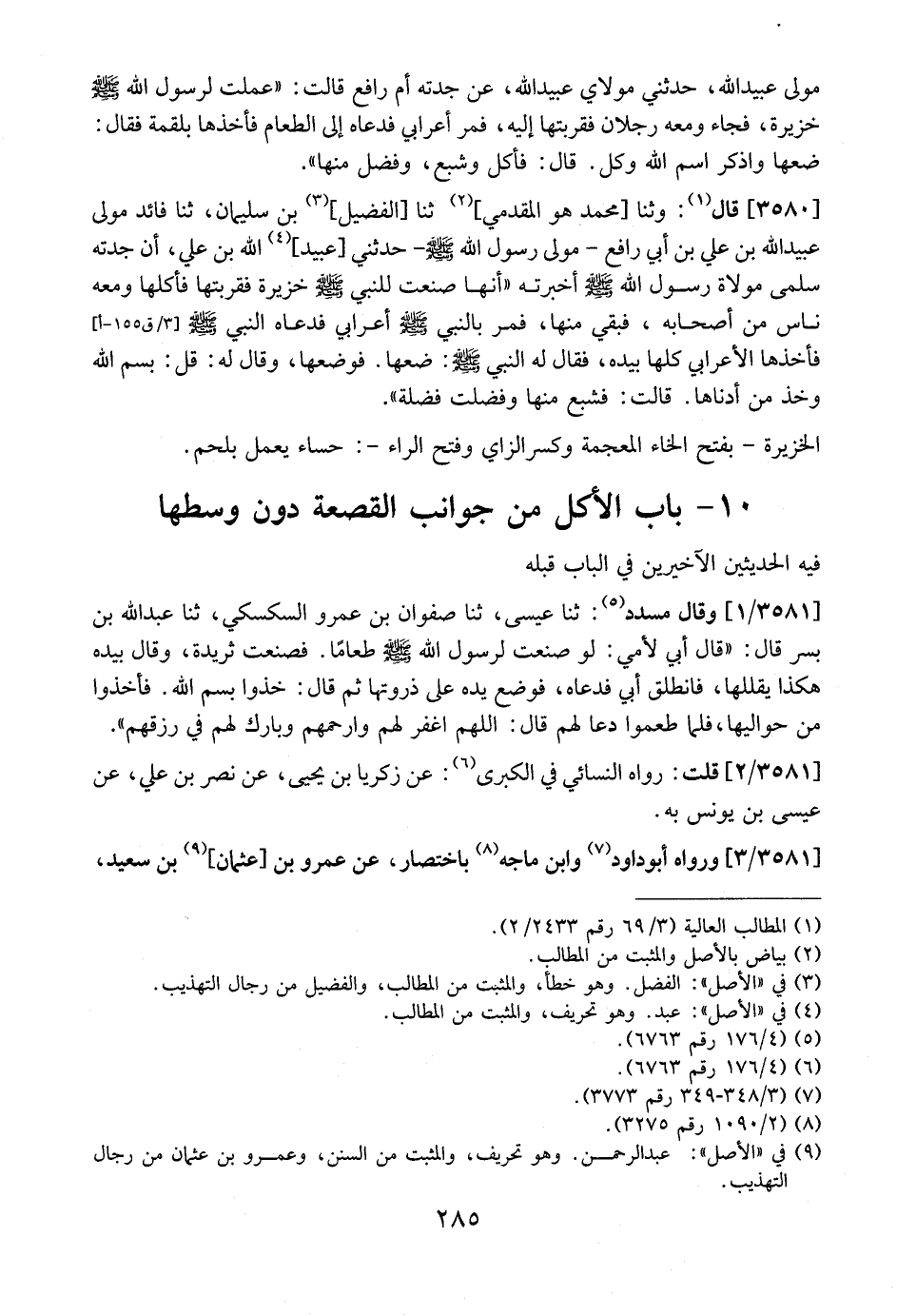 3580 - - قال: وثنا محمد هو المقدمي، ثنا الفضيل، بْنُ سُلَيْمَانَ، ثَنَا فَائِدٍ مَوْلَى عُبَيْدِ اللَّهِ بْنِ عَلِيِّ بْنِ أَبِي رَافِعٍ- مَوْلَى رَسُولِ اللَّهِ - صَلَّى اللَّهُ عَلَيْهِ وَسَلَّمَ - حدثني عبيد اللَّهِ بْنُ عَلِيٍّ، أَنَّ جَدَّتَهُ سَلْمَى مَوْلَاةَ رَسُولِ اللَّهِ - صَلَّى اللَّهُ عَلَيْهِ وَسَلَّمَ - أَخْبَرَتْهُ "أَنَّهَا صَنَعَتْ لِلنَّبِيِّ - صَلَّى اللَّهُ عَلَيْهِ وَسَلَّمَ - خزيرة فقربتها فأكلها ومعه ناس من أصحابه، فبقي منها، فَمَرَّ بِالنَّبِيِّ - صَلَّى اللَّهُ عَلَيْهِ وَسَلَّمَ -أَعْرَابِيٌّ فدعاه النَّبِيُّ - صَلَّى اللَّهُ عَلَيْهِ وَسَلَّمَ - فَأَخَذَهَا الْأَعْرَابِيُّ كُلَّهَا بِيَدِهِ، فَقَالَ لَهُ النَّبِيُّ- صَلَّى اللَّهُ عَلَيْهِ وَسَلَّمَ -: ضَعْهَا. فَوَضَعَهَا، وَقَالَ لَهُ: قُلْ: بِسْمِ اللَّهِ وَخُذْ مِنْ أَدْنَاهَا. قَالَتْ: فَشَبِعَ مِنْهَا وَفَضَلَتْ فَضْلَةٌ".
