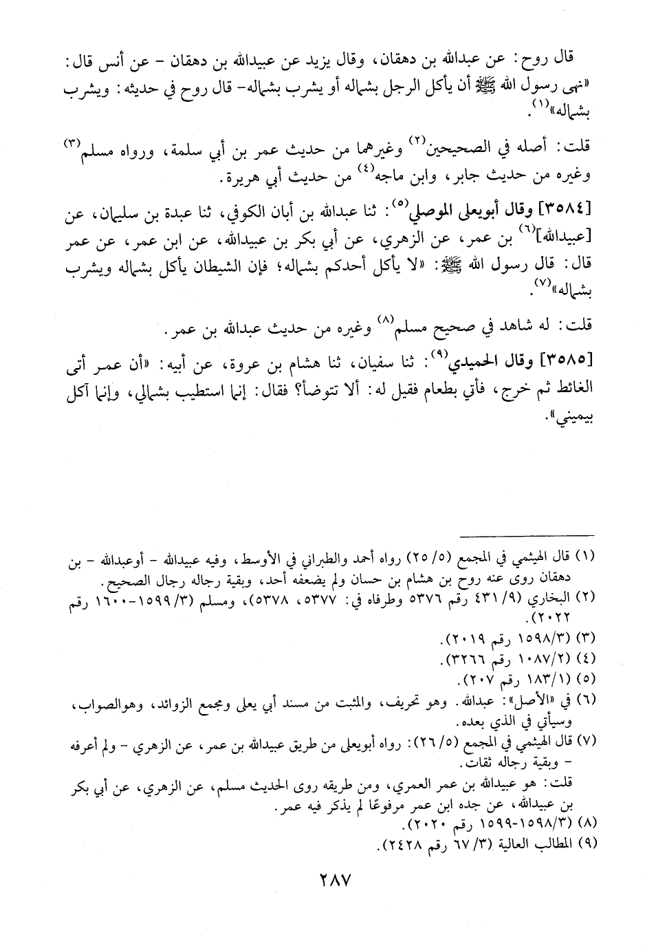 3584 - - وَقَالَ أَبُو يَعْلَى الْمَوْصِلِيُّ: ثَنَا عَبْدُ اللَّهِ بن أبان الكوفي، ثَنَا عَبْدَةُ بْنُ سليمان، عَنْ عُبَيْدِ اللَّهِ ابن عُمَرَ عَنِ الزُّهْرِيِّ، عَنْ أَبِي بَكْرِ بْنِ عُبَيْدِ اللَّهِ، عَنِ ابْنِ عُمَرَ، عَنْ عُمَرَ قَالَ: قَالَ رَسُولُ اللَّهِ- صَلَّى اللَّهُ عَلَيْهِ وَسَلَّمَ -: لَا يَأْكُلُ أَحَدُكُمْ بِشِمَالِهِ فَإِنَّ الشَّيْطَانَ يَأْكُلُ بِشِمَالِهِ وَيَشْرَبُ بِشِمَالِهِ.