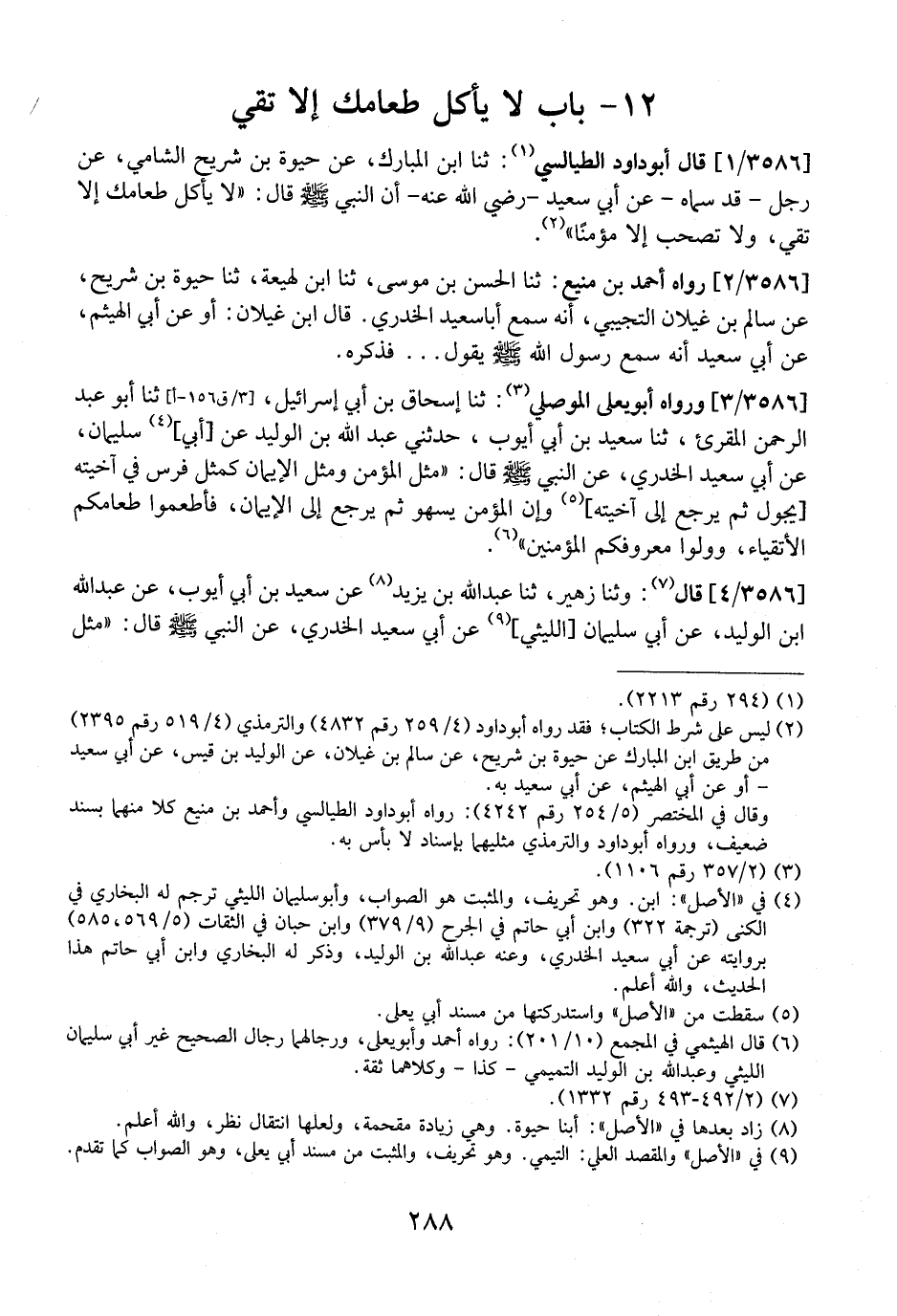 3586 / 1 - - قَالَ أَبُو دَاوُدَ الطَّيَالِسِيُّ: ثَنَا ابْنُ الْمُبَارَكِ، عَنْ حَيْوَةَ بْنِ شُرَيْحٍ الشَّامِيِّ، عَنْ رَجُلٍ- قَدْ سَمَّاهُ- عَنْ أَبِي سَعِيدٍ- رَضِيَ اللَّهُ عَنْهُ- أَنّ النَّبِيَّ - صَلَّى اللَّهُ عليه وسلم - قال: "لَا يَأْكُلُ طَعَامَكَ إِلَّا تَقِيٌّ، وَلَا تَصْحَبْ إِلَّا مُؤْمِنًا".
