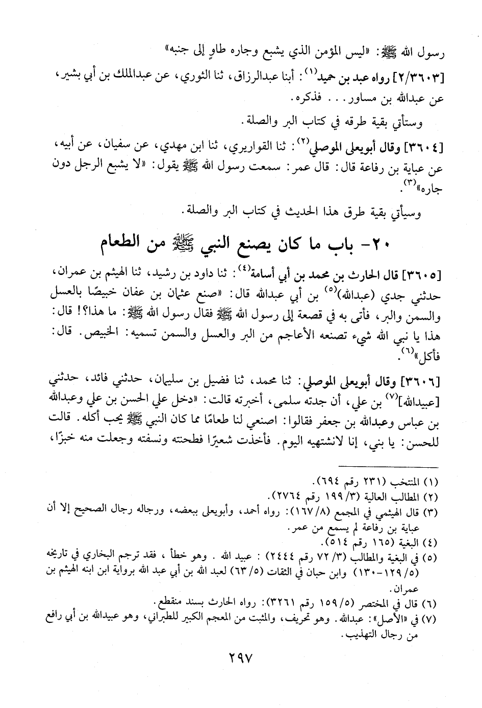 3605 - - قَالَ الْحَارِثُ بْنُ مُحَمَّدِ بْنِ أَبِي أُسَامَةَ: ثنا داود بن رشيد، ثنا الهيثم بن عمران، حدثني جدي (عَبْدِ اللَّهِ) بْنِ أَبِي عَبْدِ اللَّهِ قَالَ: "صنع عثمان بن عفان خَبِيصًا بِالْعَسَلِ وَالسَّمْنِ وَالْبُرِّ، فَأَتَى بِهِ فِي قَصْعَةٍ إِلَى رَسُولِ اللَّهِ - صَلَّى اللَّهُ عَلَيْهِ وَسَلَّمَ - فَقَالَ رَسُولُ اللَّهِ- صَلَّى اللَّهُ عَلَيْهِ وَسَلَّمَ -: مَا هَذَا؟! قَالَ: هَذَا يَا نَبِيَّ اللَّهِ شَيْءٌ تَصْنَعُه الْأَعَاجِمُ مِنَ الْبُرِّ وَالْعَسَلِ والسمن تسميه: الخبيص. قال: فأكل ".