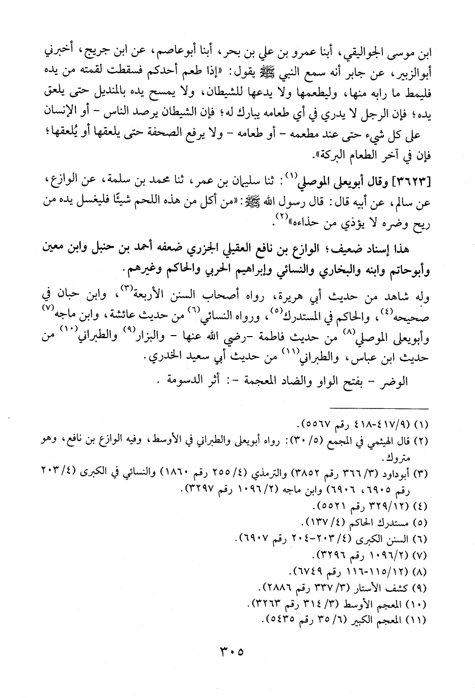 3623 - - وَقَالَ أَبُو يَعْلَى الْمَوْصِلِيُّ: ثَنَا سُلَيْمَانُ بْنُ عُمَرَ، ثنا مُحَمَّدُ بْنُ سَلَمَةَ، عَنِ الْوَازِعِ، عَنْ سَالِمٍ، عَنْ أَبِيهِ قَالَ: قَالَ رَسُولُ اللَّهِ- صَلَّى اللَّهُ عَلَيْهِ وَسَلَّمَ -: مَنْ أَكَلَ مِنْ هَذِهِ اللَّحْمِ شَيْئًا فَلْيَغْسِلْ يَدَهُ مِنْ رِيحِ وَضَرِهِ لَا يُؤْذِي من حذاءه ".