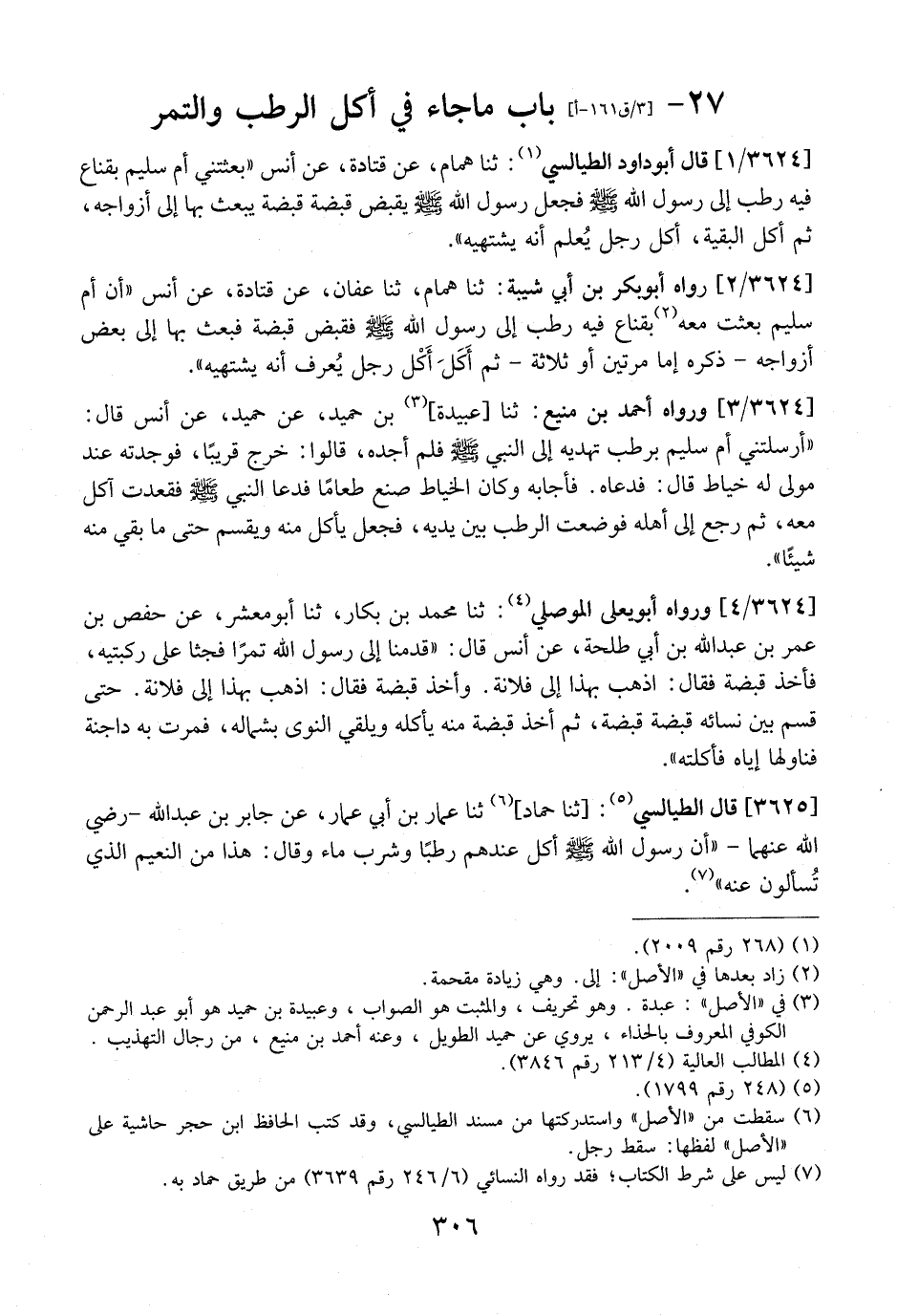 3624 / 1 - - قَالَ أَبُو دَاوُدَ الطَّيَالِسِيُّ: ثنا هَمَّامٌ، عَنْ قَتَادَةَ، عَنْ أَنَسٍ "بَعَثَتْنِي أُمُّ سُلَيْمٍ بِقِنَاعٍ فِيهِ رُطَبٌ إِلَى رَسُولِ اللَّهِ - صَلَّى اللَّهُ عَلَيْهِ وَسَلَّمَ - فَجَعَلَ رَسوُلُ اللَّهِ - صَلَّى اللَّهُ عَلَيْهِ وَسَلَّمَ - يقبض قبضة قبضة يبعث بِهَا إِلَى أَزْوَاجِهِ، ثُمَّ أَكَلَ الْبَقِيَّةَ، أَكْلُ رَجُلٍ يُعلم أَنَّهُ يَشْتَهِيهِ ".