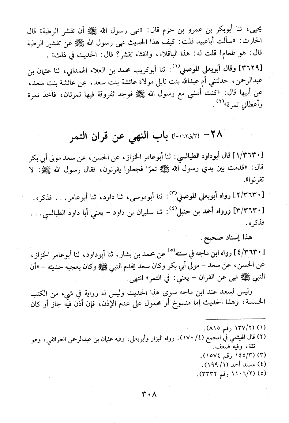 3630 / 4 - - رَوَاهُ ابْنُ مَاجَهْ فِي سُنَنِهِ عَنْ مُحَمَّدِ بْنِ بَشَّارٍ، ثنا أَبُو دَاوُدَ، ثنا أَبُو عَامِرٍ الْخَزَّازُ، عَنِ الْحَسَنِ، عَنْ سَعْدٍ- مَوْلَى أَبِي بَكْرٍ وَكَانَ سَعْدٌ يَخْدُمُ النَّبِيَّ - صَلَّى اللَّهُ عَلَيْهِ وَسَلَّمَ - وَكَانَ يُعْجِبُهُ حَدِيثَهُ- أَنّ النَّبِيَّ - صَلَّى اللَّهُ عَلَيْهِ وَسَلَّمَ - نَهَى عَنِ الْقِرَانِ- يَعْنِي: فِي التَّمْرِ" انْتَهَى.