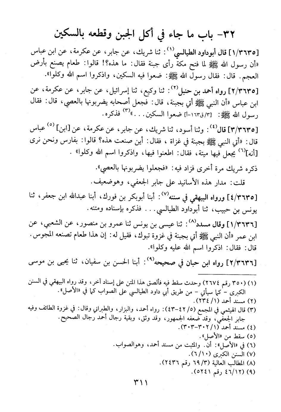 3635 / 1 - - قَالَ أَبُو دَاوُدَ الطَّيَالِسِيُّ: ثَنَا شَرِيكٌ، عَنْ جَابِرٍ، عَنْ عِكْرِمَةَ، عَنِ ابْنِ عَبَّاسٍ "أَنّ رَسُولَ اللَّهِ - صَلَّى اللَّهُ عَلَيْهِ وَسَلَّمَ - لَمَّا فَتَحَ مَكَّةَ رَأَى جُبْنَةً فَقَالَ: مَا هَذِهِ؟! قَالُوا: طَعَامٌ يُصْنَعُ بِأَرْضِ الْعَجَمِ. قَالَ: فَقَالَ رَسُولُ اللَّهِ- صَلَّى اللَّهُ عَلَيْهِ وسلم -: ضعوافيه السِّكِّينَ، وَاذْكُرُوا اسْمَ اللَّهِ وَكُلُوا".