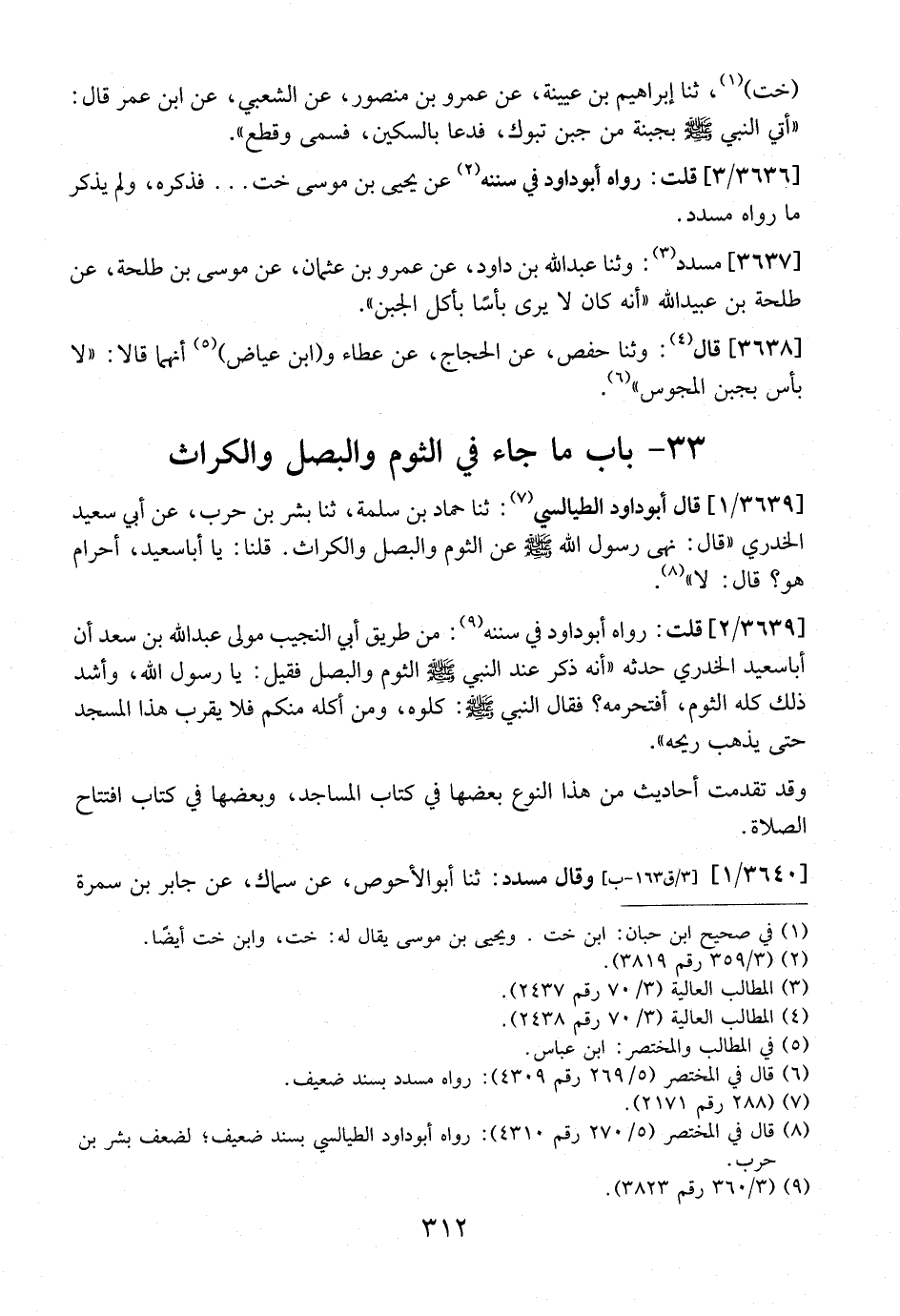 3639 / 2 - - قُلْتُ: رَوَاهُ أَبُو داود في عشه: مِنْ طَرِيقِ أَبِي النَّجِيبِ مَوْلَى عَبْدِ اللَّهِ بن سعد أن أباسعيد الْخُدْرِيَّ حَدَّثَهُ "أَنَّهُ ذَكَرَ عِنْدَ النَّبِيِّ - صَلَّى اللَّهُ عَلَيْهِ وَسَلَّمَ - الثَّوْمَ وَالْبَصَلَ فَقِيلَ: يَا رَسُولَ اللَّهِ، وَأَشَدُّ ذَلِكَ كُلُّهُ الثَّوْمُ، أفتحرمه؟ فَقَالَ النَّبِيُّ- صَلَّى اللَّهُ عَلَيْهِ وَسَلَّمَ -: كُلُوهُ، وَمَنْ أَكَلَهُ مِنْكُمْ فَلَا يَقْرَبُ هَذَا الْمَسْجِدَ حَتَّى يَذْهَبَ رِيحُهُ ". وَقَدْ تَقَدَّمَتْ أَحَادِيثُ مِنْ هَذَا النَّوْعِ بَعْضُهَا فِي كِتَابِ الْمَسَاجِدِ، وَبَعْضُهَا فِي كِتَابِ افْتِتَاحِ الصَّلَاةِ.