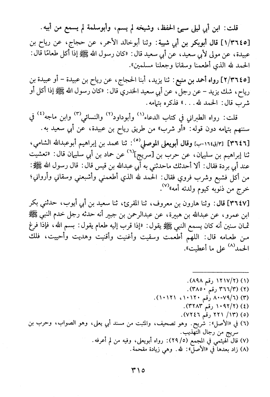 3646 - -وَقَالَ أَبُو يَعْلَى الْمَوْصِلِيُّ: ثَنَا مُحَمَّدُ بْنُ إِبْرَاهِيمَ أَبُو عَبْدِ اللَّهِ الشَّامِيُّ، ثنا إِبْرَاهِيمُ بْنُ سُلَيْمَانَ، عَنْ حَرْبِ بْنِ سُرَيْجٍ، عَنْ حَمَّادِ بْنِ أَبِي سُلَيْمَانَ قَالَ: "تَعَشَّيْتُ عِنْدَ أَبِي بُرْدَةَ فَقَالَ: ألا أحدثك ماحدثني بِهِ أَبِي عَبْدُ اللَّهِ بْنِ قَيْسٍ قَالَ: قَالَ رَسُولُ اللَّهِ- صَلَّى اللَّهُ عَلَيْهِ وسلم -: مَنْ أَكَلَ فَشَبِعَ وَشَرِبَ فَرَوِيَ فَقَالَ: الْحَمْدُ لله الذي أطعمني وأشبعني وسقاني وأرواني؟ خرخ مِنْ ذُنُوبِهِ كَيَوْمِ وَلَدَتْهُ أُمُّهُ ".