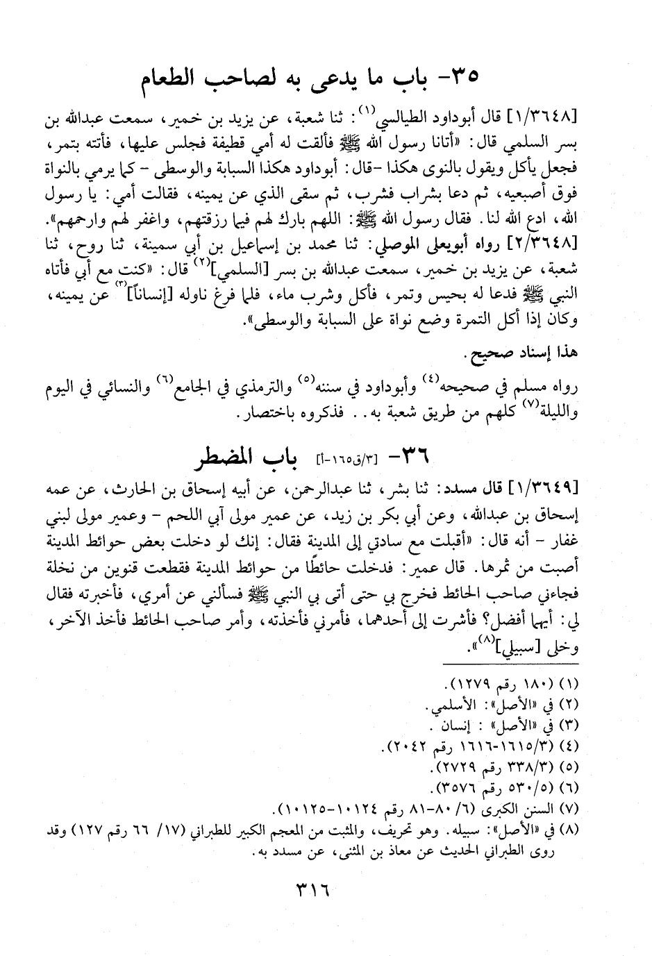 3649 / 1 - - قَالَ مُسَدَّدٌ: ثَنَا بِشْرٌ، ثَنَا عَبْدُ الرَّحْمَنُ، عَنْ أَبِيهِ إِسْحَاق بْن الحارث، عَنْ عمه إِسْحَاقَ بْنِ عَبْدِ اللَّهِ، وَعَنْ أَبِي بَكْرِ بْنِ زَيْدٍ، عَنْ عُمَيْرٍ مولى أبي اللحم- وَعُمَيْرٌ مَوْلَى لِبَنِي غِفَارٍ- أَنَّهُ قَالَ: "أَقْبَلْتُ مع سادتي إلى المدينة فَقَالَ: إِنَّكَ لَوْ دَخَلْتَ بَعْضَ حَوَائِطِ الْمَدِينَةِ أَصَبْتَ مِنْ ثَمَرِهَا. قَالَ عُمَيْرٌ: فَدَخَلْتُ حَائِطًا مِنْ حَوَائِطِ الْمَدِينَةِ فَقَطَعْتُ قِنْوَيْنِ مِنْ نَخْلَةٍ فجاءني صاجط الْحَائِطِ فَخَرَجَ بِي حَتَّى أَتَى بِي النَّبِيَّ صَلَّى اللَّهُ عَلَيْهِ وَسَلَّمَ فَسَأَلَنِي عَنْ أَمْرِي، فَأَخْبَرْتُهُ فَقَالَ لِي: أَيُّهُمَا أَفْضَلُ؟ فَأَشَرْتُ إِلَى أَحَدِهِمَا، فَأَمَرَنِي فَأَخَذْتُهُ، وَأَمَرَ صَاحِبَ الْحَائِطِ فَأَخَذَ الاَخر، وخلى سبيلي، ".