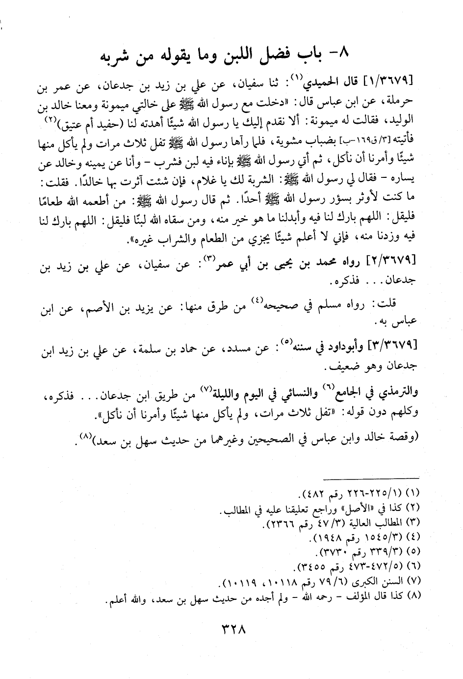 3679 / 1 - قَالَ الْحُمَيْدِيُّ: ثنا سُفْيَانُ، عَنْ عَلِيِّ بْنِ زَيْدِ بْنِ جُدْعَانَ، عَنْ عُمَرَ بْنِ حَرْمَلَةَ، عَنِ ابْنِ عَبَّاسٍ قَالَ: "دَخَلْتُ مَعَ رَسُولِ اللَّهِ - صَلَّى اللَّهُ عَلَيْهِ وَسَلَّمَ - عَلَى خَالَتِي مَيْمُونَةَ وَمَعَنَا خَالِدُ بْنُ الْوَلِيدِ، فَقَالَتْ لَهُ مَيْمُونَةُ: أَلَا نُقَدِّمُ إِلَيْكَ يَا رَسُولَ اللَّهِ شَيْئًا أَهْدَتْهُ لَنَا (حَفِيدُ أُمِّ عَتِيقٍ) فَأَتَيْتُهُ بِضَبَابٍ مَشْوِيَةٍ، فَلَمَّا رَآهَا رَسُولُ اللَّهِ - صَلَّى اللَّهُ عَلَيْهِ وَسَلَّمَ - تَفِلَ ثَلَاثَ مَرَّاتٍ وَلَمْ يَأْكُلْ مِنْهَا شَيْئًا وَأَمَرَنَا أَنْ نَأْكُلَ، ثُمَّ أَتَى رَسُولَ اللَّهِ - صَلَّى اللَّهُ عَلَيْهِ وَسَلَّمَ - بِإِنَاءٍ فِيهِ لَبَنٌ فَشَرِبَ- وَأَنَا عَنْ يَمِينِهِ وَخَالِدٌ عَنْ يَسَارِهِ- فَقَالَ لِي رَسُولُ اللَّهِ- صَلَّى اللَّهُ عَلَيْهِ وَسَلَّمَ -: الشَّرْبَةُ لَكَ يَا غلام، فإن عشت آثرت بها خالدًا. فقلت: ما كنت لأوثر بِسُؤْرِ رَسُولِ اللَّهِ - صَلَّى اللَّهُ عَلَيْهِ وَسَلَّمَ - أَحَدًا. ثُمَّ قَالَ رَسُولُ اللَّهِ- صَلَّى اللَّهُ عَلَيْهِ وَسَلَّمَ -: مَنْ أَطْعَمَهُ اللَّهُ طَعَامًا فَلْيَقُلِ: اللَّهُمَّ بَارِكْ لَنَا فِيهِ وَأَبْدِلْنَا مَا هُوَ خير مِنْهُ، وَمَنْ سَقَاهُ اللَّهُ لَبَنًا فَلْيَقُلِ: اللَّهُمَّ بارك لنا فيه وزدنا منه، فإني لَا أَعْلَمُ شَيْئًا يُجْزِي مِنَ الطَّعَامِ وَالشَّرَابِ غيره ".