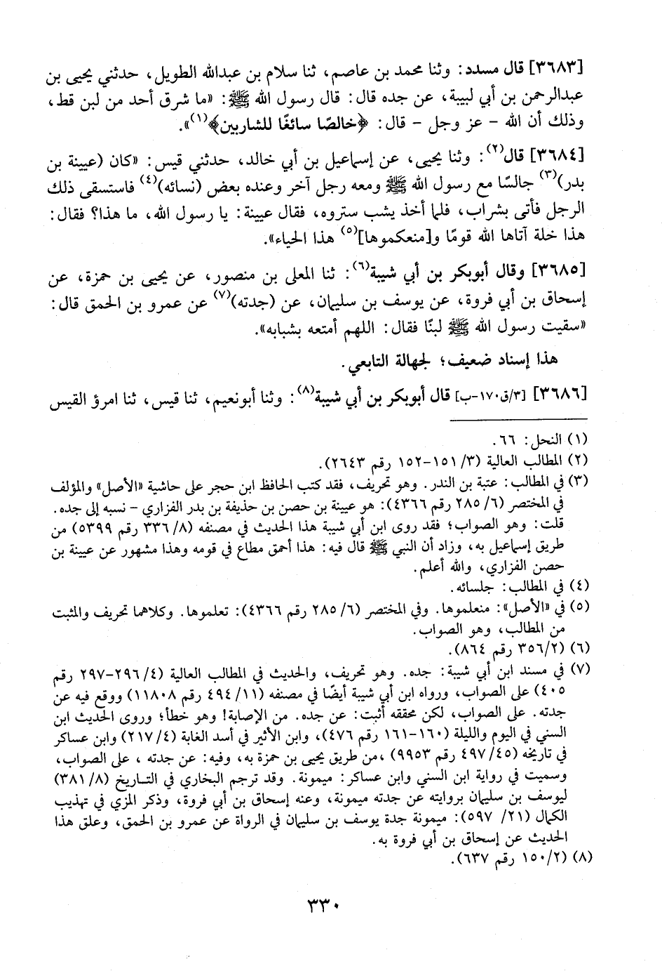 3684 - - قَالَ: وثنا يَحْيَى، عَنْ إِسْمَاعِيلَ بْنِ أَبِي خالد، حدثني قيس: {كَانَ (عُيَيْنَةُ بْنُ بَدْرٍ) جَالِسًا مَعَ رَسُولِ اللَّهِ - صَلَّى اللَّهُ عَلَيْهِ وَسَلَّمَ - ومعه رَجُلٍ آخَرَ وَعِنْدَهِ بَعْضُ (نِسَائِهِ) فَاسْتَسْقَى ذَلِكَ الرجل فأتى بشراب، فلما أخذ يشب سَتَرُوهُ، فَقَالَ عُيَيْنَةُ: يَا رَسُولَ اللَّهِ، مَا هذا؟ فقال: هذا خلة آتاها الله قوماً ومنعكموها هَذَا الْحَيَاءُ} .