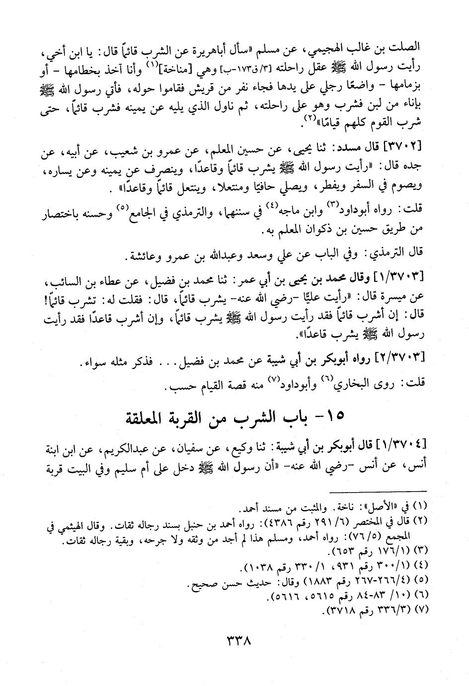 3703 / 1 - وقال محمد بن يحى بْنِ أَبِي عُمَرَ: ثَنَا مُحَمَّدُ بنِ فُضَيْلٍ، عَنْ عَطَاءِ بْنِ السَّائِبِ، عَنْ مَيْسَرَةَ قَالَ: "رأيت عليًّا- رَضِيَ اللَّهُ عَنْهُ- يَشْرَبُ قائماَ، قَالَ: فَقُلْتُ له: تشرب قائماً! قال: إلط أَشْرَبْ قَائِمًا فَقَدْ رَأَيْتُ رَسُولَ اللَّهِ - صَلَّى اللَّهُ عَلَيْهِ وَسَلَّمَ - يَشْرَبُ قَائِمًا، وَإِنْ أَشْرَبْ قاعدًا فقد رأيت رسول الله يَشْرَبُ قَاعِدًا".