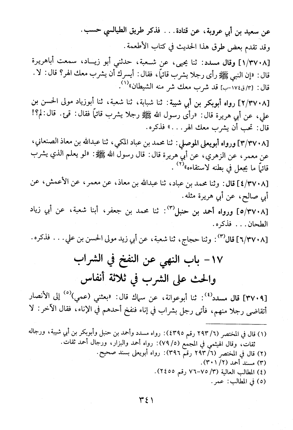 3708 / 1 - وَقَالَ مُسَدَّد: ثَنَا يَحْيَى، عَنْ شُعْبَةَ، حَدَّثَنِي أَبُو زياد، سمعت أباهريرة قَالَ: "أَنَّ النَّبِيَّ - صَلَّى اللَّهُ عَلَيْهِ وَسَلَّمَ - رَأَى رَجُلًا يَشْرَبُ قَائِمًا، فَقَالَ: أَيَسُرُّكَ أَنْ يَشْرَبَ مَعَكَ الْهِرُّ؟ قَالَ: لَا. قَالَ: قَدْ شَرِبَ مَعَكَ شَرٌّ مِنْهُ الشَّيْطَانِ ".