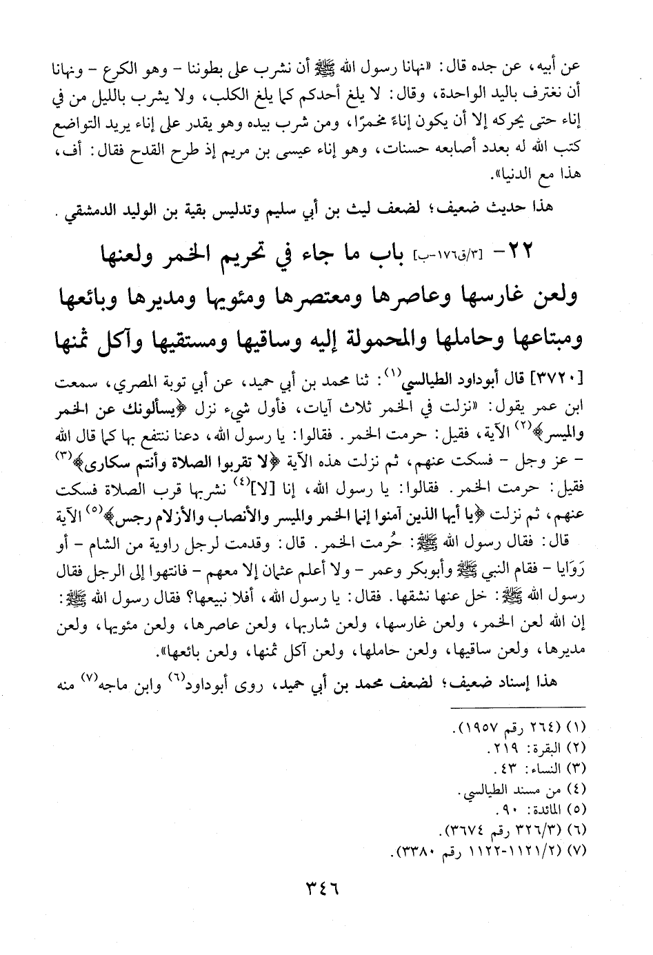 3720 - قَالَ أَبُو دَاوُدَ الطَّيَالِسِيُّ: ثَنَا مُحَمَّدُ بْنُ أَبِي حُمَيْدٍ، عَنْ أَبِي توبة المصري، سمعت ابن عمر يقوله: "نَزَلَتْ فِي الْخَمْرِ ثَلَاثُ آيَاتٍ، فَأَوَّلُ شَيْءٍ نزل ?ويسألونك عن الخمر والميسر? الاية، فَقِيلَ: حُرِّمَتِ الْخَمْرُ. فَقَالُوا: يَا رَسُولَ اللَّهِ، دَعْنَا نَنْتَفِعُ بِهَا كَمَا قَالَ اللَّهُ - عَزَّ وَجَلَّ- فَسَكَتْ عَنْهُمْ، ثُمَّ نَزَلَتْ هَذِهِ الْآيَةُ ?لا تقربوا الصلاة وأنتم سكارى? فَقِيلَ: حُرِّمَتِ الْخَمْرُ. فَقَالُوا: يَا رَسُولَ اللَّهِ، إنا لا نَشْرَبُهَا قُرْبَ الصَّلَاةِ فَسَكَتَ عَنْهُمْ، ثُمَّ نَزَلَتْ ?يا أيها الَّذِينَ آمَنُوا إِنَّمَا الْخَمْرُ وَالْمَيْسِرُ وَالأَنْصَابُ وَالأَزْلامُ رجس? الاَية قَالَ: فَقَالَ رَسُولُ اللَّهِ- صَلَّى اللَّهُ عَلَيْهِ وَسَلَّمَ -: حُرمت الْخَمْرُ. قَالَ: وَقَدَّمْتُ لِرَجُلٍ رَاوِيَةٌ مِنَ الشَّامِ- أَوْ رَوَايا- فَقَامَ النَّبِيُّ - صَلَّى اللَّهُ عَلَيْهِ وَسَلَّمَ - وَأَبُو بَكْرِ وَعُمَرُ- وَلَا أَعْلَمُ عُثْمَانَ إِلَّا مَعَهُمْ- فَانْتَهَوْا إِلَى الرَّجُلِ فَقَالَ رَسُولُ اللَّهِ- صَلَّى اللَّهُ عَلَيْهِ وَسَلَّمَ -: خل عَنْهَا نَشْقَهَا. فَقَالَ: يَا رَسُولَ اللَّهِ، أَفَلَا نَبِيعُهَا؟ فَقَالَ رَسُولُ اللَّهِ- صَلَّى اللَّهُ عَلَيْهِ وَسَلَّمَ -: إِنَّ اللَّهَ لَعَنَ الْخَمْرَ، وَلَعَنَ غَارِسَهَا، ولعن شاربها، ولعن عاصرها، ولعن مئويها، وَلَعَنَ مُدِيرَهَا، وَلَعَنَ سَاقِيَهَا، وَلَعَنَ حَامِلَهَا، وَلَعَنَ آكِلَ ثَمَنِهَا، وَلَعَنَ بَائِعَهَا".