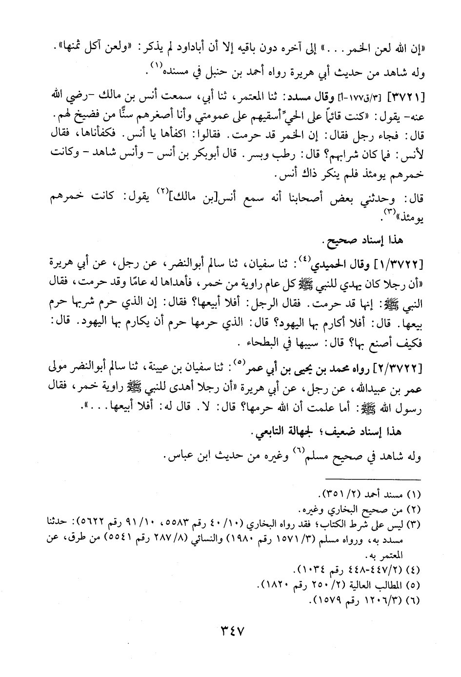 3722 / 1 - وَقَالَ الْحُمَيْدِيُّ: ثنا سُفْيَانُ، ثنا سَالِمٌ أَبُو النَّضْرِ، عَنْ رَجُلٍ، عَنْ أَبِي هُرَيْرَةَ "أَنَّ رَجُلًا كَانَ يَهْدِي لِلنَّبِيِّ - صَلَّى اللَّهُ عَلَيْهِ وَسَلَّمَ - كُلَّ عَامٍ رَاوِيَةً مِنْ خَمْرٍ، فَأَهْدَاهَا لَهُ عَامًا وَقَدْ حُرِّمَتْ، فَقَالَ النَّبِيُّ- صَلَّى اللَّهُ عَلَيْهِ وَسَلَّمَ -: إِنَّهَا قَدْ حُرِّمَتْ. فَقَالَ الرَّجُلُ: أَفَلَا أبيعها؟ فَقَالَ: إِنَّ الَّذِي حَرَّمَ شُرْبَهَا حَرَّمَ بَيْعَهَا. قَالَ: أَفَلَا أُكَارِمُ بِهَا الْيَهُودَ؟ قَالَ: الَّذِي حَرَّمَهَا حَرَّمَ أَنْ يُكَارِمَ بِهَا الْيَهُودُ. قَالَ: فَكَيْفَ أَصْنَعُ بِهَا؟ قَالَ: سَيِّبْهَا فِي الْبَطْحَاءِ.