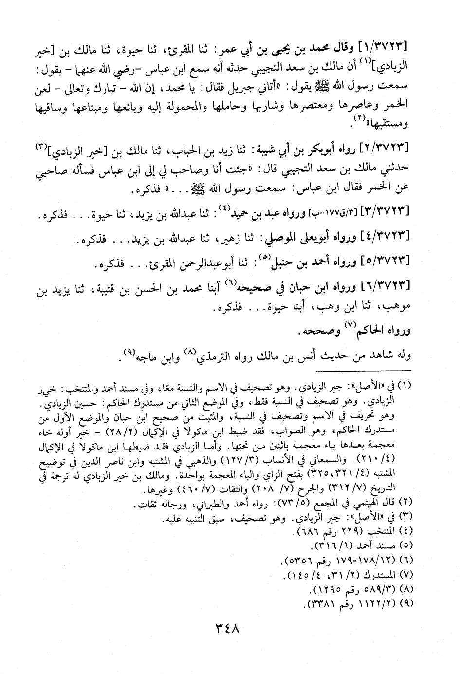 3723 / 2 - رَوَاهُ أَبُو بَكْرِ بْنُ أَبِي شَيْبَةَ: ثنا زيد بن الحباب، ثنا مالك بن أخير الزبادي، حدثني مالك بن محعد التجيبي قال: "جئت أنا وصاحب لي إِلَى ابْنِ عَبَّاسٍ فَسَأَلَهُ صَاحِبِي عَنِ الْخَمْرِ فَقَالَ ابْنُ عَبَّاسٍ: سَمِعْتُ رَسُولَ اللَّهِ- صَلَّى اللَّهُ عَلَيْهِ وَسَلَّمَ - ... " فَذَكَرَهُ.