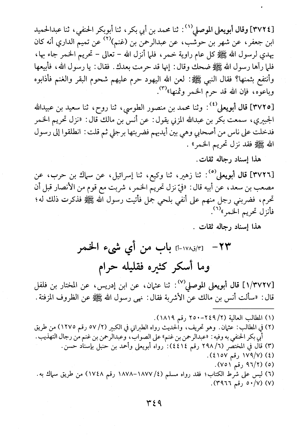 3725 - قَالَ أَبُو يَعْلَى: وثنا مُحَمَّدُ بْنُ مَنْصُورٍ الطُّوسِيُّ، ثنا رَوْحٌ، ثنا سَعِيدُ بْنُ عُبَيْدِ اللَّهِ الْجُبَيْرِيُّ، سَمِعْتُ بَكْرَ بْنَ عَبْدِ اللَّهِ الْمُزَنِيَّ يَقُولُ: عَنْ أَنَسِ بْنِ مَالِكٍ قَالَ: نَزَلَ تَحْرِيمُ الْخَمْرِ فَدَخَلْتُ عَلَى نَاسٍ مِنْ أَصْحَابِي وَهِيَ بَيْنَ أَيْدِيهِمْ فَضَرَبْتُهَا بِرِجْلِي ثُمَّ قُلْتُ: انْطَلِقُوا إِلَى رَسُولِ اللَّهِ - صَلَّى اللَّهُ عَلَيْهِ وَسَلَّمَ - فقد نَزَلَ تَحْرِيمُ الْخَمْرِ".