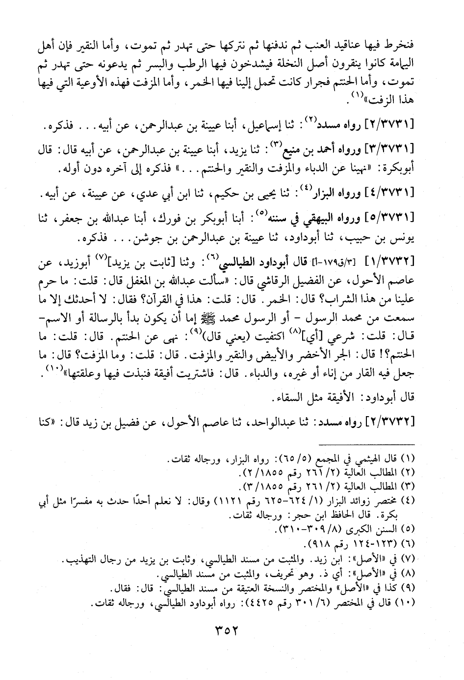 3732 / 1 - قال أبو داود الطيالسي: وثنا ثابت بن يزيد، أَبُو زَيْدٍ، عَنْ عَاصِمٍ الْأَحْوَلٍ، عَنِ الْفُضَيْلِ الرَّقَاشِيِّ قَالَ: "سَأَلْتُ عَبْدَ اللَّهِ بْنَ الْمُغَفَّلِ قَالَ: قُلْتُ: مَا حُرِّمَ عَلَيْنَا مِنْ هَذَا الشَّرَابِ؟ قَالَ: الْخَمْرُ. قَالَ: قُلْتُ: هَذَا فِي الْقُرَآنِ؟ فَقَالَ: لَا أُحَدِّثُكَ إِلَّا مَا سَمِعْتُ مِنْ مُحَمَّدٍ الرَّسُولِ- أَوِ الرَّسُولِ مُحَمَّدٍ- صَلَّى اللَّهُ عَلَيْهِ وَسَلَّمَ - إِمَّا أَنْ يَكُونَ بَدَأَ بِالرِّسَالَةِ أَوِ الِاسْمِ- قَالَ: قُلْتُ: شَرْعِيٌّ أيْ، اكْتَفَيْتَ (يَعْنِي قَالَ) : نَهَى عَنِ الْحَنْتَمِ. قَالَ: قلت: ما الْحَنْتَمُ؟! قَالَ: الْجَرُّ الْأَخْضَرُ وَالْأَبْيَضُ وَالنَّقِيرِ وَالْمُزَفَّتِ. قَالَ: قُلْتُ: وَمَا الْمُزَفَّتُ؟ قَالَ: مَا جُعِلَ فِيهِ الْقَارُ مِنْ إِنَاءٍ أَوْ غَيْرِهِ، وَالدُّبَّاءِ. قَالَ: فَاشْتَرَيْتُ أفيقة فَنَبَذْتُ فِيهَا وَعَلَّقْتُهَا". قَالَ أبو داود: الأفيقة مِثْلُ السِّقَاءِ.