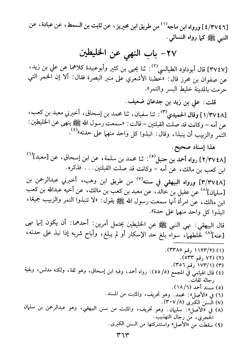 3748 / 3 - وَرَوَاهُ الْبَيْهَقِيُّ فِي سُنَنِهِ أن طَرِيقِ ابْنِ وَهْبٍ، أَخْبَرَنِي عَبْدُ الرَّحْمَنِ بْنُ سُلَيْمَانَ، عَنْ عُقَيْلِ بْنِ خَالِدٍ، عَنْ مَعْبَدِ بْنِ كَعْبِ بْنِ مَالِكٍ، عَنْ أَخِيهِ عَبْدِ الله بن كعب ابن مَالِكٍ، عَنِ امْرَأَةٍ أَنَّهَا سَمِعَتْ رَسُولَ اللَّهِ - صَلَّى اللَّهُ عَلَيْهِ وَسَلَّمَ - يَقُولُ: "لَا تَنْبِذُوا التَّمْرَ وَالزَّبِيبَ جَمِيعًا، انْبِذُوا كُلَّ وَاحِدٍ مِنْهُمَا عَلَى حِدَةٍ".
