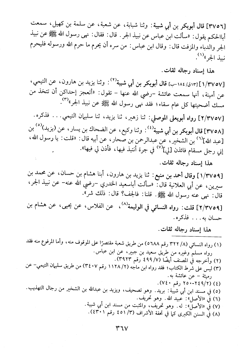 3756 - قَالَ أَبُو بَكْرِ بْنُ أَبِي شَيْبَةَ: وَثَنَا شَبَابَةُ، عَنْ شُعْبَةَ، عَنْ سَلَمَةَ بْنِ كُهْيَلٍ، سَمِعْتُ أَبَا الْحَكَمِ يَقُولُ: سَأَلْتُ ابْنَ عَبَّاسٍ عَنْ نَبِيذِ الْجَرِّ. قَالَ: فَقَالَ: نَهَى رَسُولُ اللَّهِ - صَلَّى اللَّهُ عَلَيْهِ وَسَلَّمَ - عَنْ نَبِيذِ الْجَرِّ وَالدُّبَّاءِ والمزفت قَالَ: وَقَالَ ابْنُ عَبَّاسٍ: مِنْ سَرَّهُ أَنْ يُحَرِّمَ مَا حَرَّمَ اللَّهُ ورسوله فليحرم نبيذالجر".
