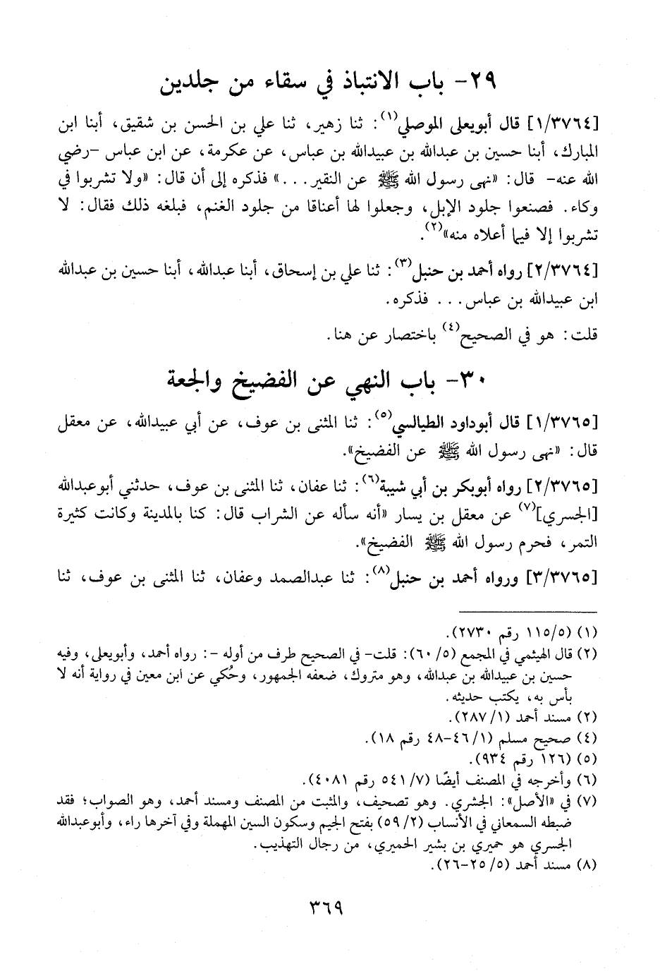 3764 / 1 - قَالَ أَبُو يَعْلَى الْمَوْصِلِيُّ: ثَنَا زُهَيْرٌ، ثَنَا علي بن الحسن بن شقيق، أبنا ابن المبارك، أبنا حُسَيْنِ بْنِ عَبْدِ اللَّهِ بْنِ عُبَيْدِ اللَّهِ بْنِ عَبَّاسٍ، عَنْ عِكْرِمَةَ، عن ابن عَبَّاسٍ- رضي اللّا، عَنْهُ- قَالَ: "نَهَى رَسُولُ اللَّهِ - صَلَّى اللَّهُ عَلَيْهِ وَسَلَّمَ - عَنِ النَّقِيرِ ... " فَذَكَرَهُ إِلَى أَنْ قال: "ولا تشربوفي وكاء. فصنعوا جلود الإبل، وجعلوالها أَعْنَاقًا مِنْ جُلُودِ الْغَنَمِ، فَبَلَغَهُ ذَلِكَ فَقَالَ: لَا تَشْرَبُوا إِلَّا فِيمَا أَعْلَاهُ مِنْهُ ".