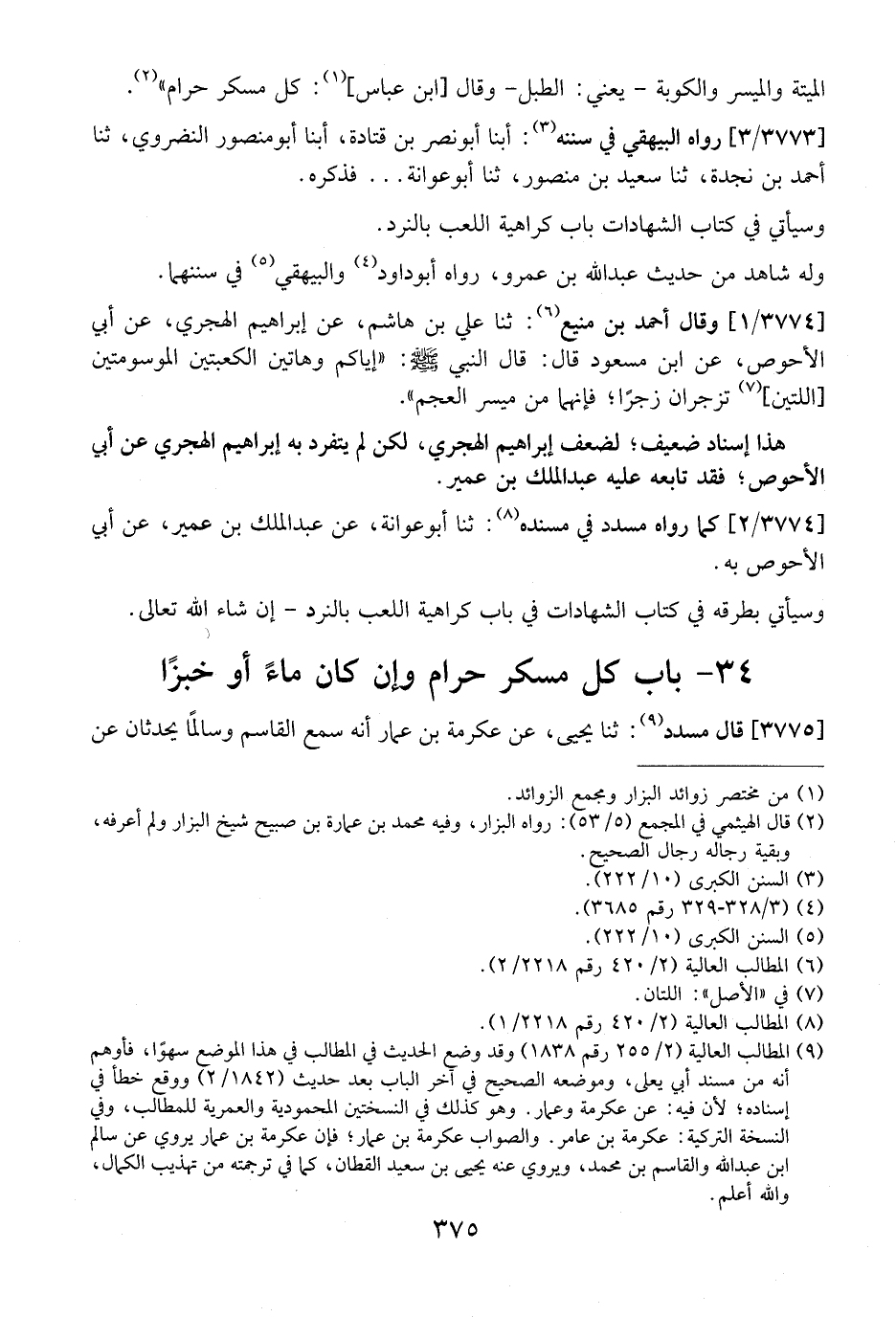 3774 / 1 - وَقَالَ أَحْمَدُ بْنُ مَنِيعٍ: ثَنَا عَلِيُّ بْنُ هَاشِمٍ، عَنْ إِبْرَاهِيمَ الْهَجَرِيِّ، عَنْ أَبِي الْأَحْوَصِ، عَنْ ابْنِ مَسْعُودٍ قَالَ: قَالَ النَّبِيُّ- صَلَّى اللَّهُ عَلَيْهِ وَسَلَّمَ -: إِيَّاكُمْ وَهَاتَيْنِ الكعبتين الموسومتين اللتين تَزْجُرَانِ زَجْرًا فَإِنَّهُمَا مِنْ مَيْسِرِ الْعَجَمِ ".