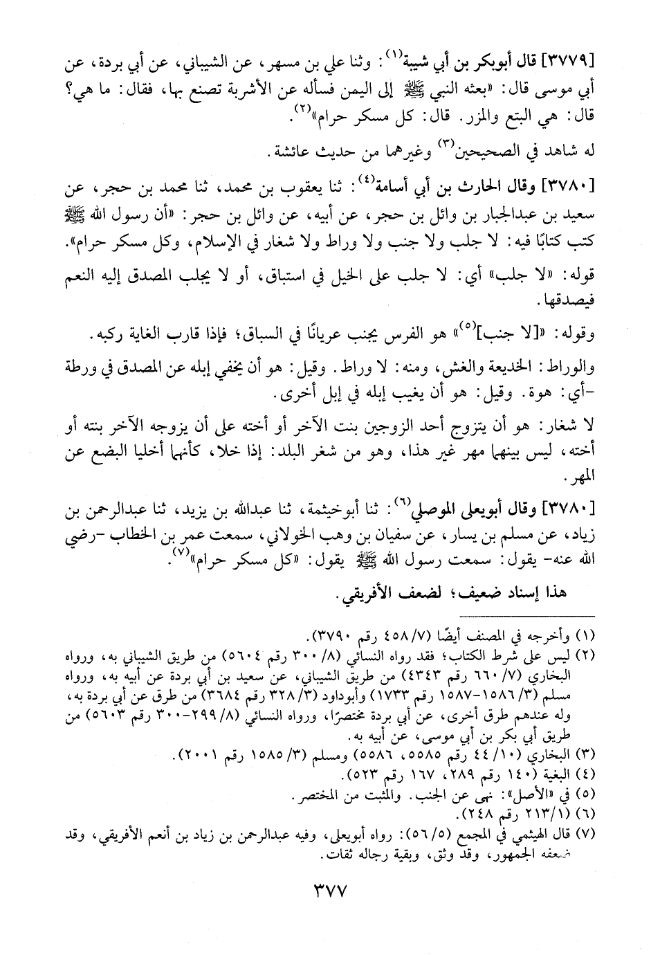 3779 - قَالَ أَبُو بَكْرِ بْنُ أَبِي شَيْبَةَ: وَثَنَا عَلِيُّ بْنُ مُسْهِرٍ، عَنِ الشَّيْبَانِيِّ، عَنْ أَبِي بُرْدَةَ، عَنْ أَبِي مُوسَى قَالَ: "بَعَثَهُ النَّبِيُّ - صَلَّى اللَّهُ عَلَيْهِ وَسَلَّمَ - إِلَى الْيَمَنِ فَسَأَلَهُ عَنِ الْأَشْرِبَةِ تُصْنَعُ بِهَا، فَقَالَ: مَا هِيَ قَالَ: هِيَ الْبِتْعُ وَالْمِزْرُ. قَالَ: كُلُّ مسكر حرام.