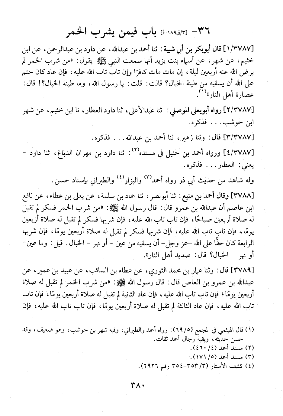 3788 - وَقَالَ أَحْمَدُ بْنُ مَنِيعٍ: ثَنَا أَبُو نَصْرٍ، ثَنَا حَمَّادُ بْنُ سَلَمَةَ، عَنْ يَعْلَى بْنِ عَطَاءٍ، عن نافع ابن عَاصِمٍ أَنَّ عَبْدِ اللَّهِ بْنِ عَمْرٍو قَالَ: قَالَ رَسُولُ اللَّهِ- صَلَّى اللَّهُ عَلَيْهِ وسلم -: أن شرب الخمر فسكر تقبل لَهُ صَلَاةٌ أَرْبَعِينَ صَبَاحًا، فَإِنْ تَابَ تَابَ الله عليه، فإن شربها فسكر لم تقبل له صلاة أر بعين يَوْمًا، فَإِنْ تَابَ تَابَ اللَّهُ عَلَيْهِ، فَإِنْ قربها فسكر لَمْ تُقْبَلْ لَهُ صَلَاةٌ أَرْبَعِينَ يَوْمًا، فَإِنْ شَرِبَهَا الرَّابِعَةَ كَانَ حَقًّا عَلَى اللَّهِ- عَزَّ وَجَلَّ- أَنْ يَسْقِيَهُ مِنْ عَيْنِ- أَوْ نَهْرِ- الْخَبَالِ. قِيلَ: وَمَا عَيْنُ- أَوْ نَهْرُ- الْخَبَالِ؟ قَالَ: صَدِيدُ أَهْلِ النَّارِ".
