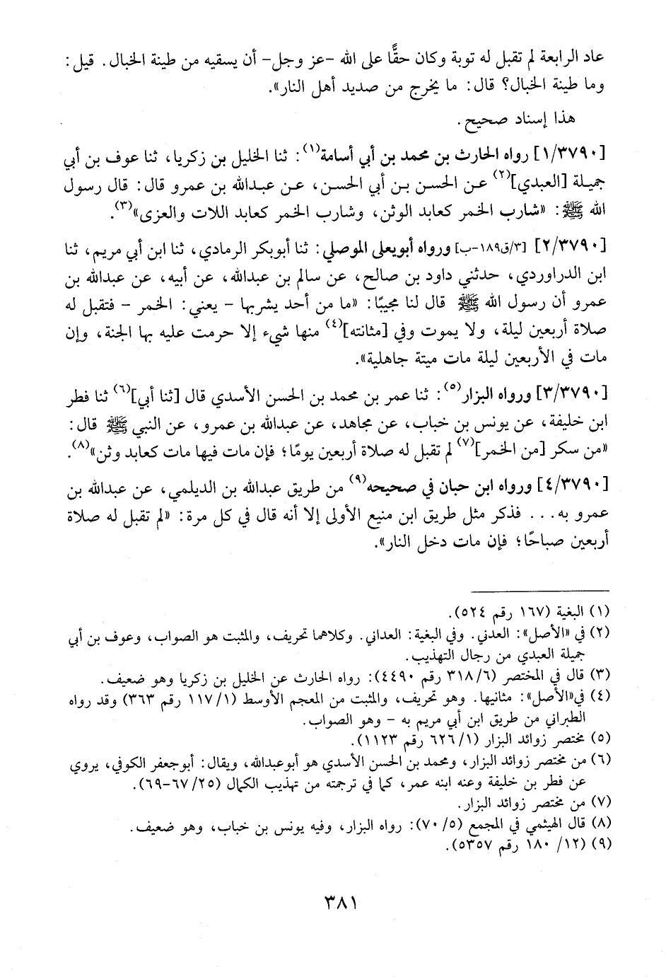 3790 / 1 - رَوَاهُ الْحَارِثُ بْنُ مُحَمَّدِ بْنِ أَبِي أُسَامَةَ: ثَنَا الْخَلِيلُ بْنُ زَكَرِيَّا، ثنا عَوْفُ بْنُ أَبِي جَمِيلَةَ العبديَ، عَنِ الْحَسَنِ بْنِ أَبِي الْحَسَنِ، عَنْ عَبْدِ اللَّهِ بْنِ عَمْرٍو قَالَ: قَالَ رَسُولُ اللَّهِ- صَلَّى اللَّهُ عَلَيْهِ وسلم -: "شَارِبُ الْخَمْرِ كَعَابِدِ الْوَثَنِ، وَشَارِبُ الْخَمْرِ كَعَابِدِ اللات وَالْعُزَّى.