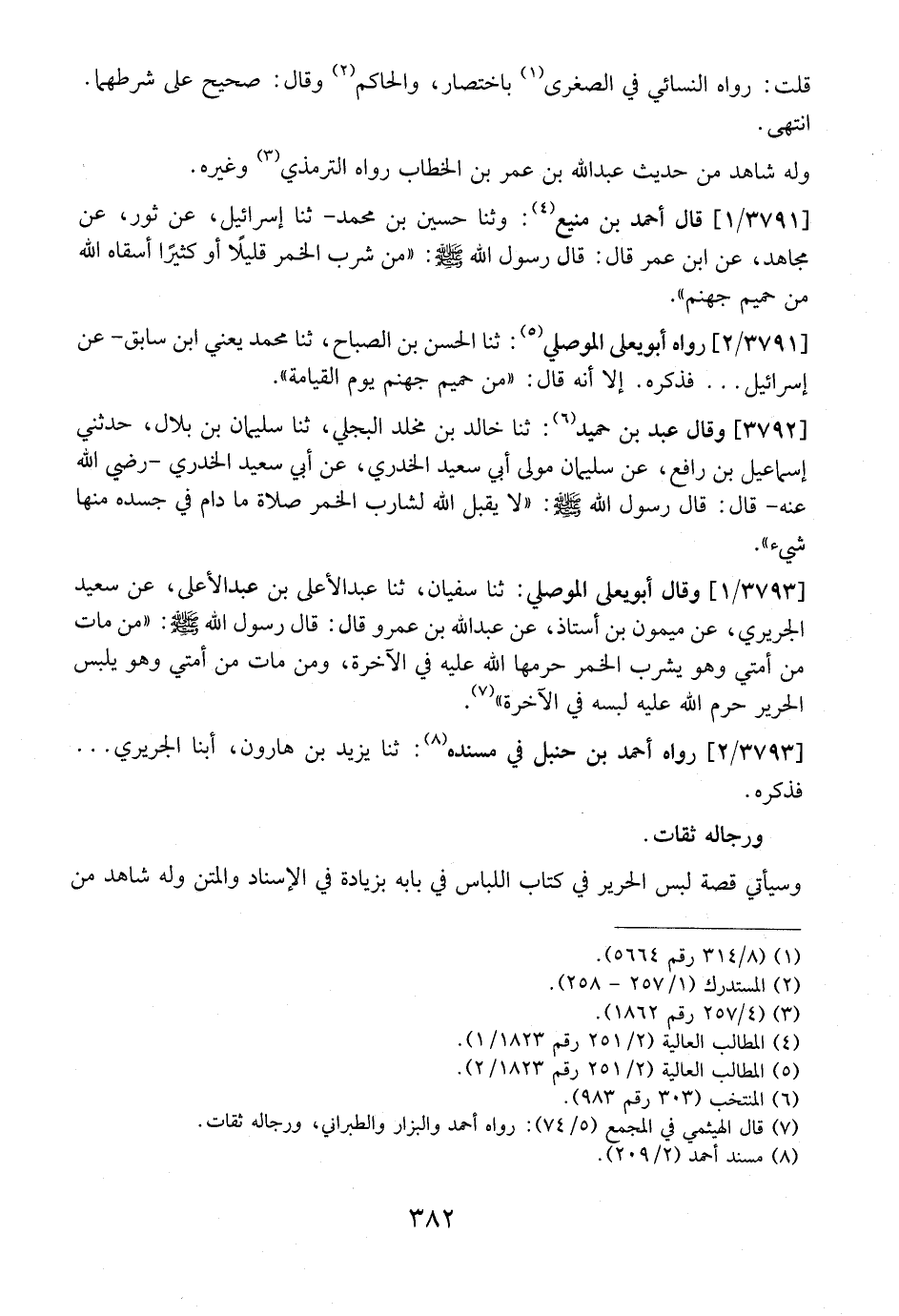 3793 / 1 - وَقَالَ أَبُو يَعْلَى الْمَوْصِلِيُّ: ثَنَا سُفْيَانُ، ثَنَا عَبْدُ الْأَعْلَى بْنُ عَبْدِ الْأَعْلَى، عَنْ سعيد الجريري، عن ميمون بن أستاذ، عَنْ عَبْدِ اللَّهِ بْنِ عَمْرٍو قَالَ: قَالَ رَسُولُ اللَّهِ- صَلَّى اللَّهُ عَلَيْهِ وَسَلَّمَ -: مَنْ مَاتَ مِنْ أُمَّتِي وَهُوَ يَشْرَبُ الْخَمْرَ حَرَّمَهَا اللَّهُ عَلَيْهِ فِي الاَخرة، وَمَنْ مَاتَ مِنْ أُمَّتِي وَهُوَ يَلْبَسُ الْحَرِيرَ حَرَّمَ اللَّهُ عَلَيْهِ لُبْسَهُ فِي الْآخِرَةِ".